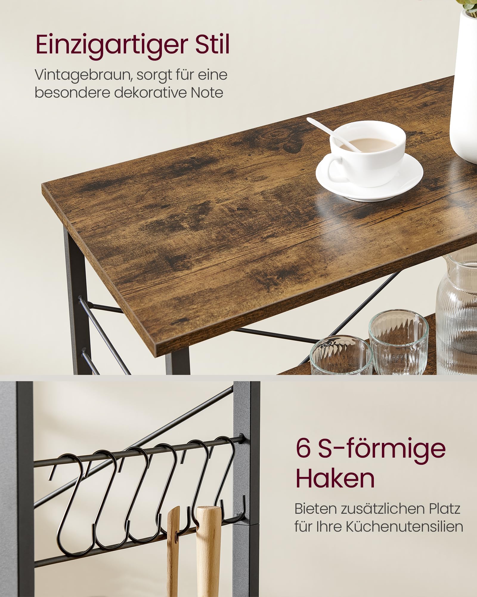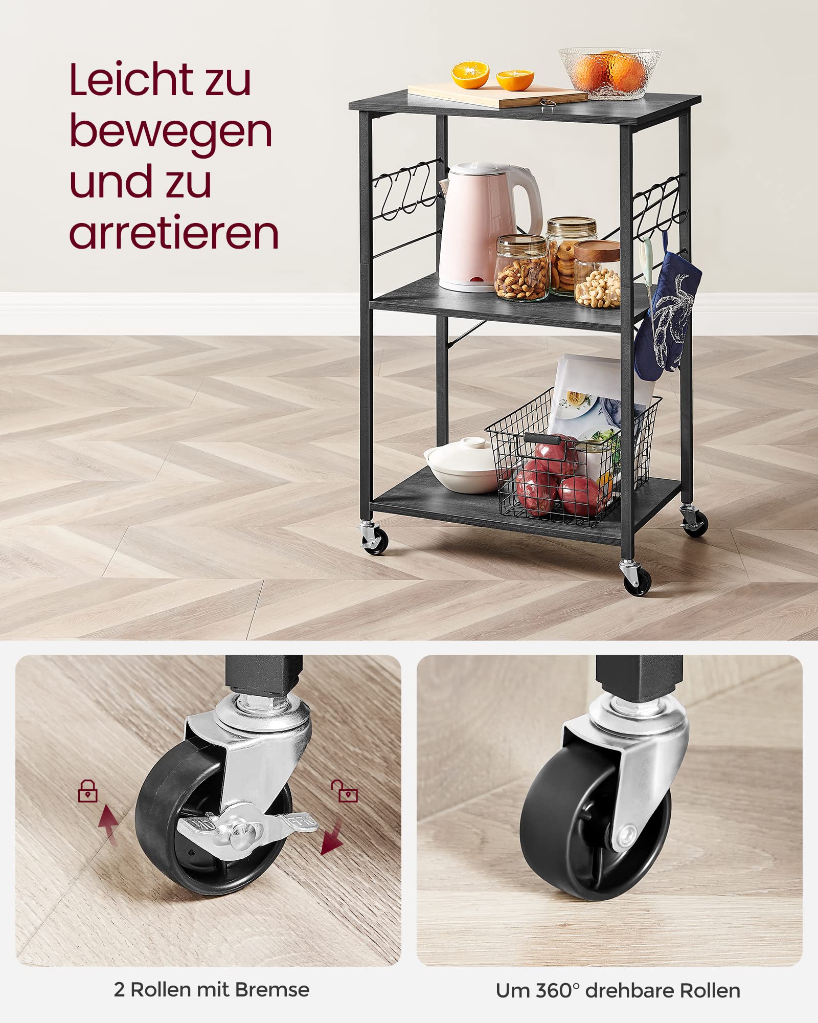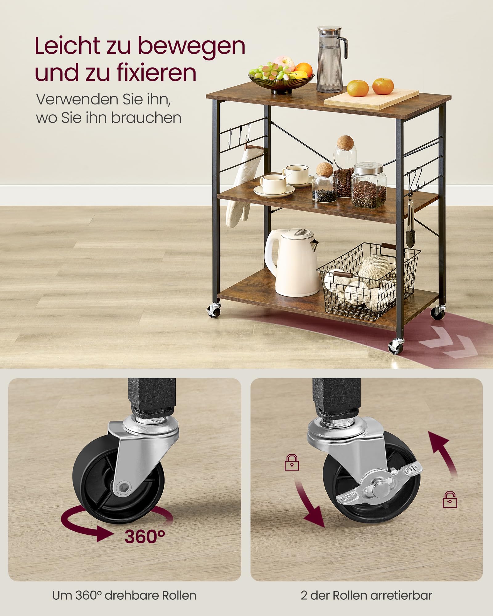 VASAGLE KKS60XV1 Kitchen Rack on Wheels Serving Trolley 3 Tier Kitchen Trolley Mini Oven Microwave Metal Frame 6 Hooks 40 x 60 x 89 cm Vintage Brown Ink Black