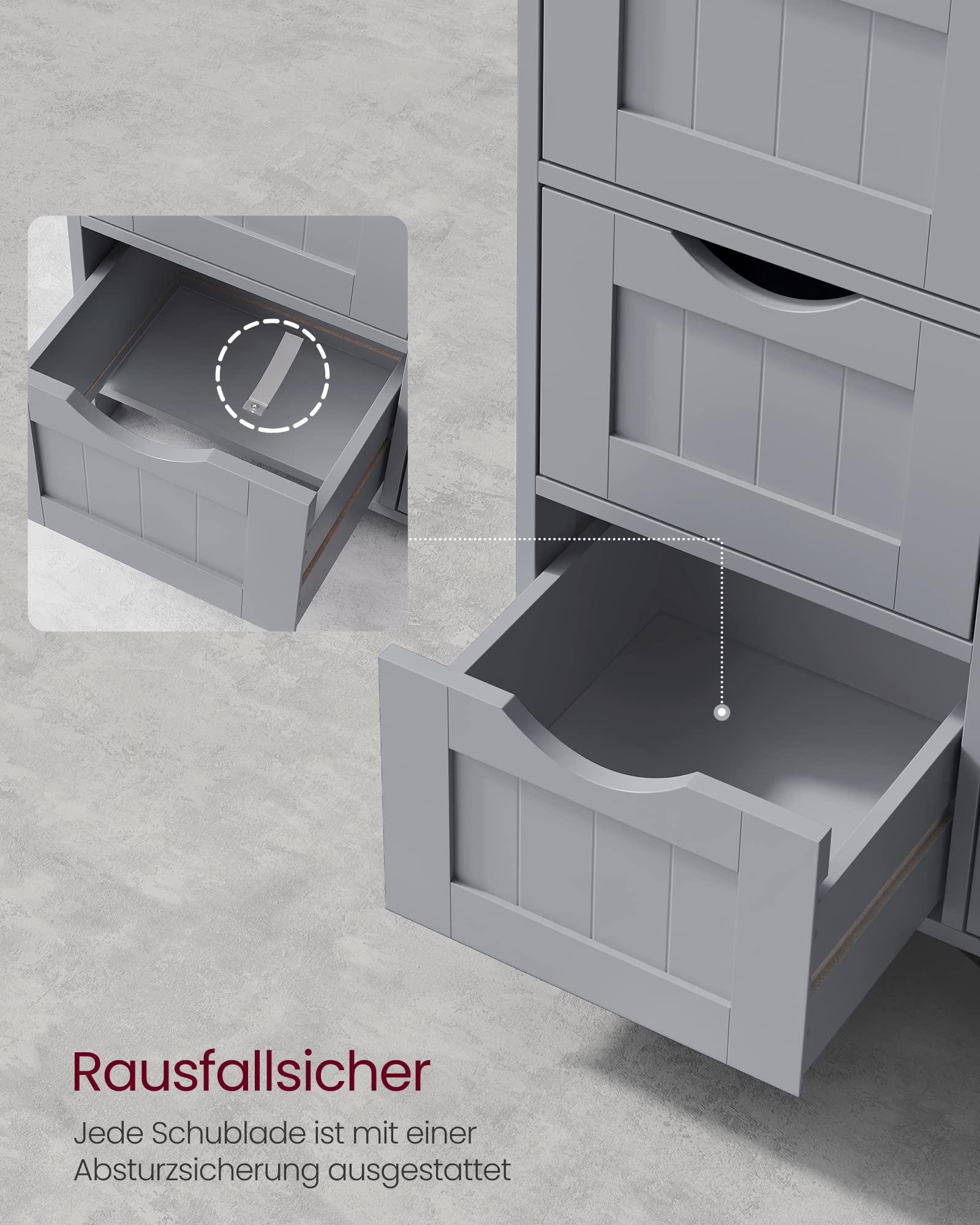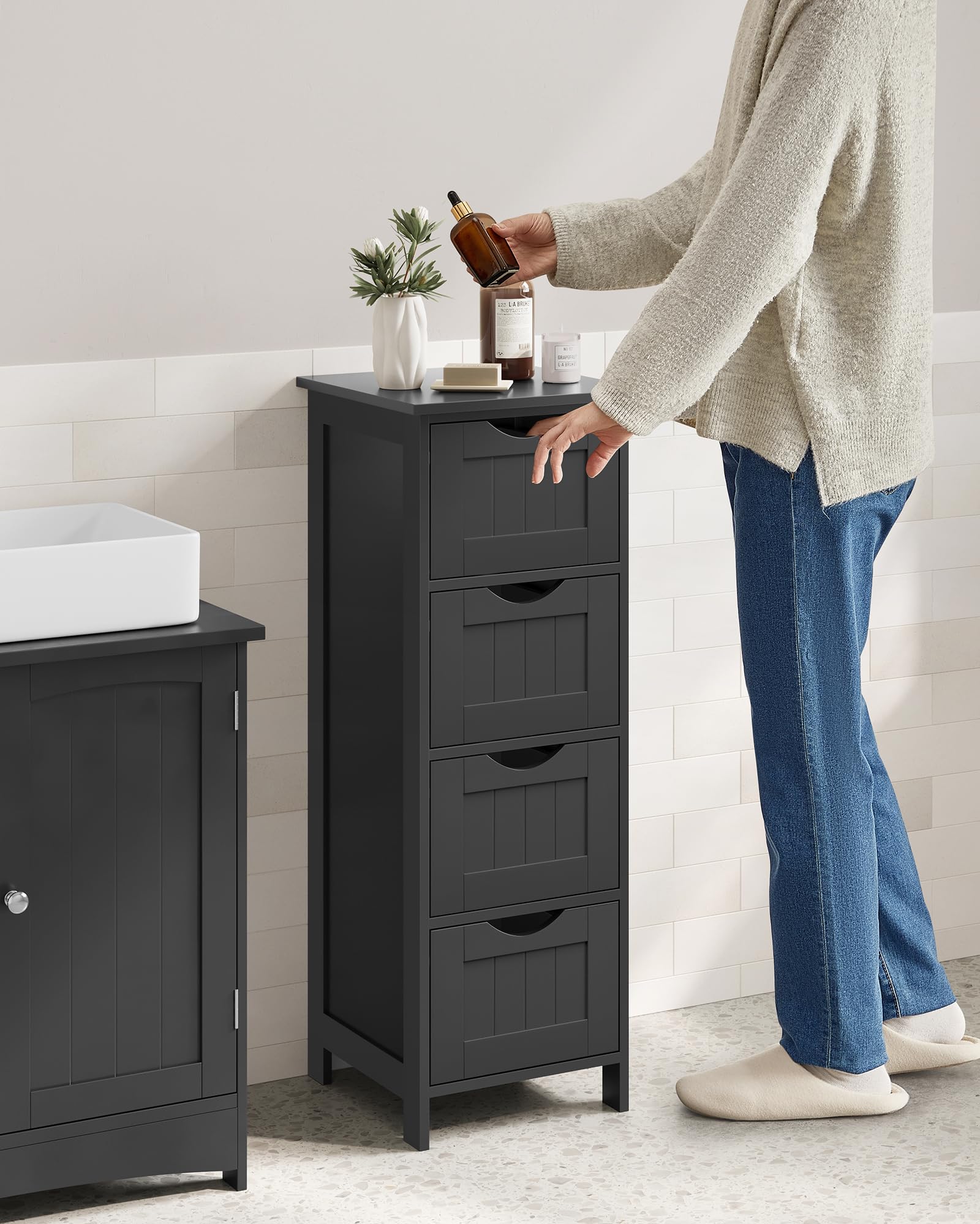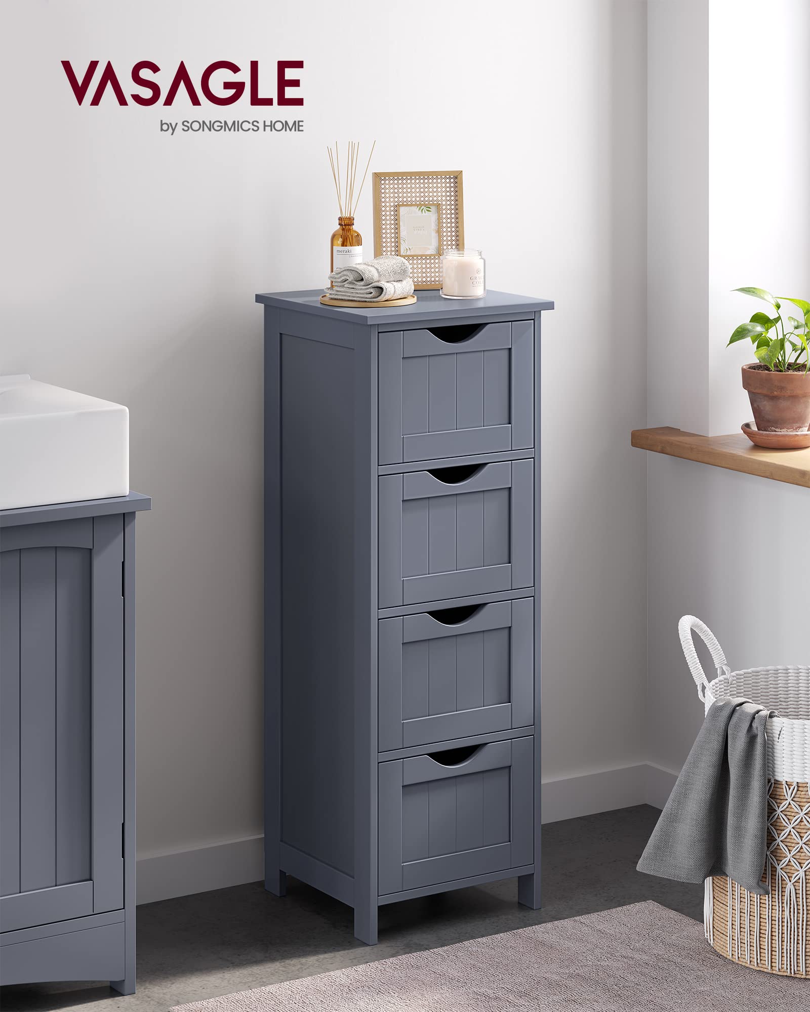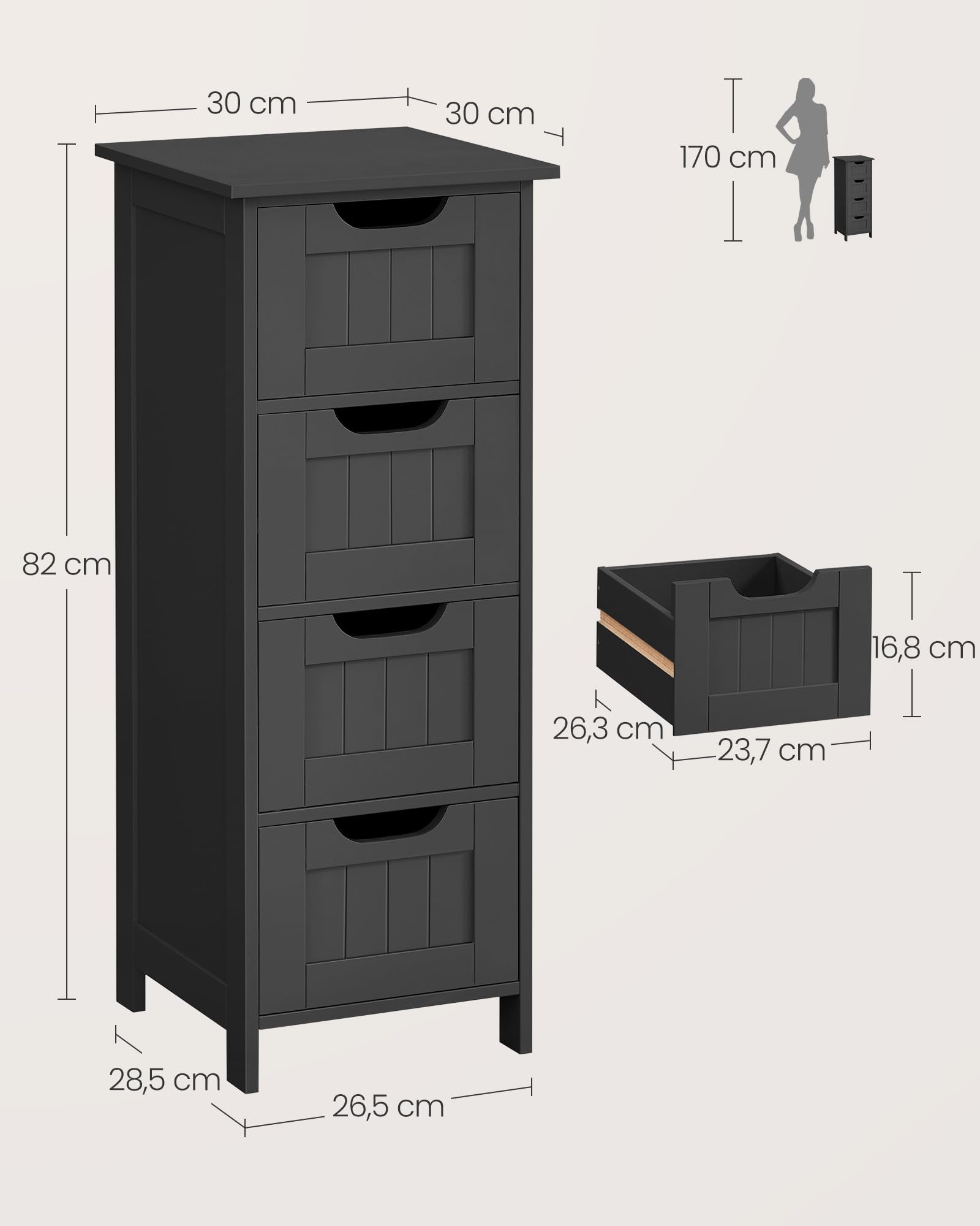- Spacious and space-saving: This bathroom cabinet with 4 drawers provides plenty of space for your items such as towels, toilet paper rolls, perfume and more. With a size of 30 x 30 x 82 cm, this cabinet takes up little floor space.