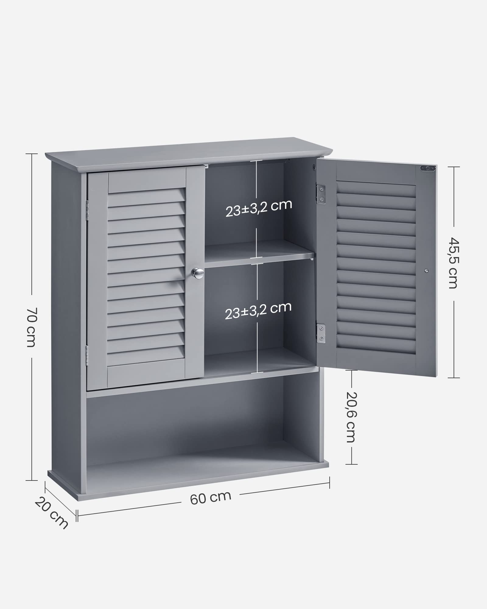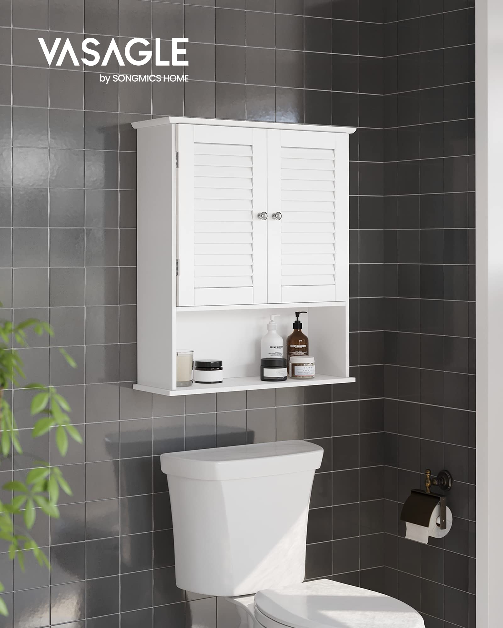 VASAGLE Wall Mounted Bathroom Cabinet, Medicine Cabinet with Height-Adjustable Shelf, Double Door, Open Compartment, 60 x 20 x 70 Cm, Wood, White, BBC27WT
