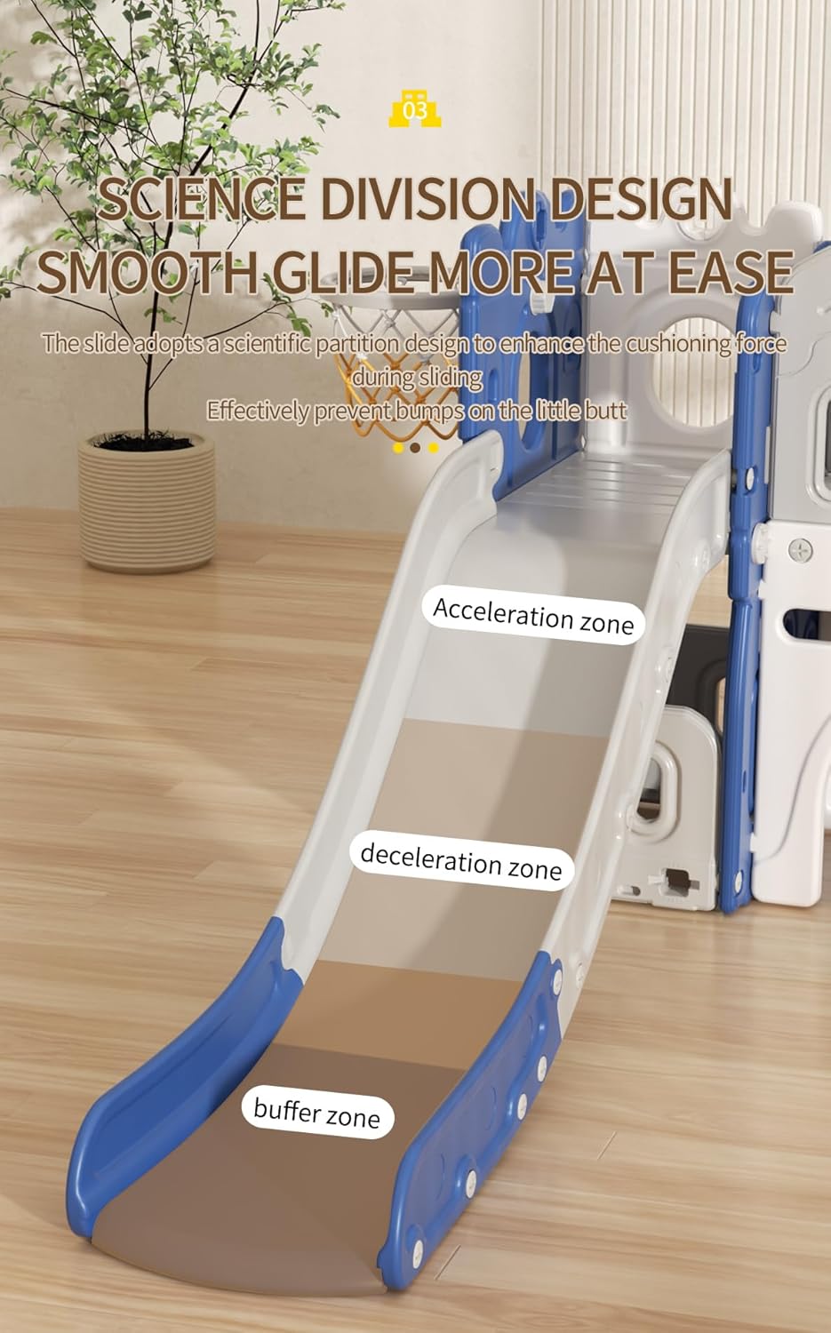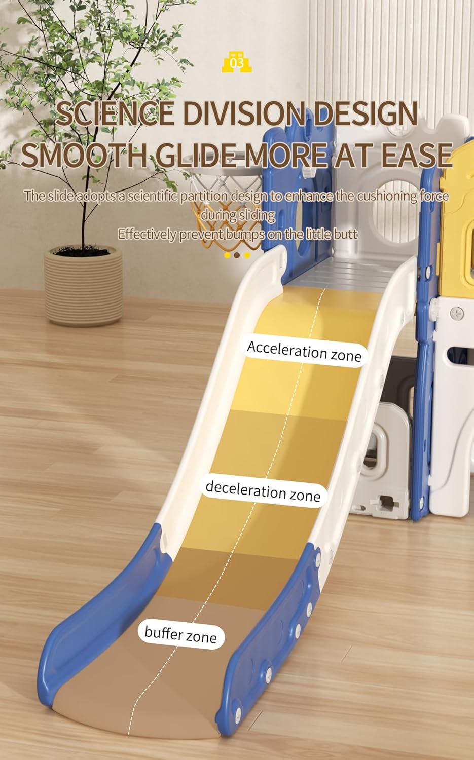 - 6-in-1 multifunctional slide design: This slide adopts a 6-in-1 design and innovation, which includes functions similar to climbing stairs, slide, storage, basketball, crawling through hole and aisle platform. By combining these six functions, babies can climb stairs, store toys in the tower and experience the fun of sliding and shooting. It allows babies to experience multiple joys while using it to love them and double their happiness.