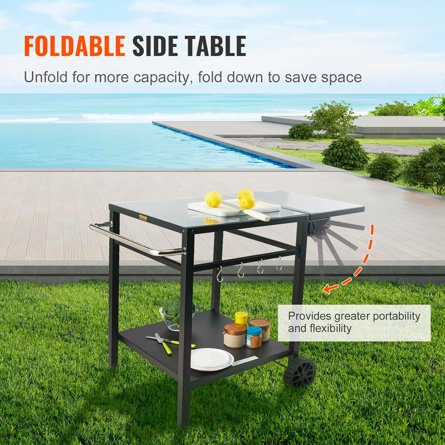 - FOLDING SIDE TABLE This mobile grill table for food preparation is equipped with a folding table top. When unfolded, the side table offers additional storage space. When not in use, the side table can be folded down to save storage space. In addition, the edges of the table top have been carefully polished to avoid scratches on the hands.