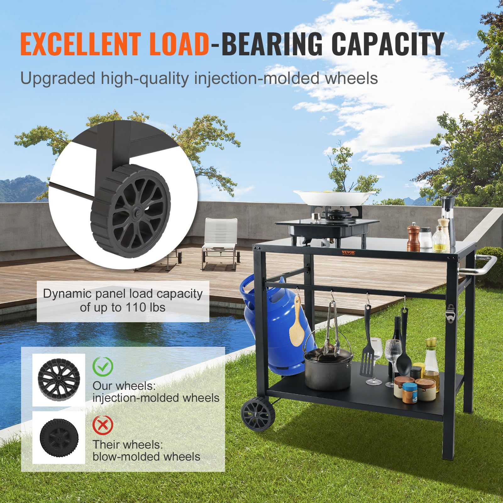 VEVOR Serving Trolley, Kitchen Trolley, 100 x 64 x 83.5 cm, Outdoor Barbecue Dining Trolley with Double Shelf, Movable Grill Table for Preparing Food, Multifunctional Iron Table Top, Black