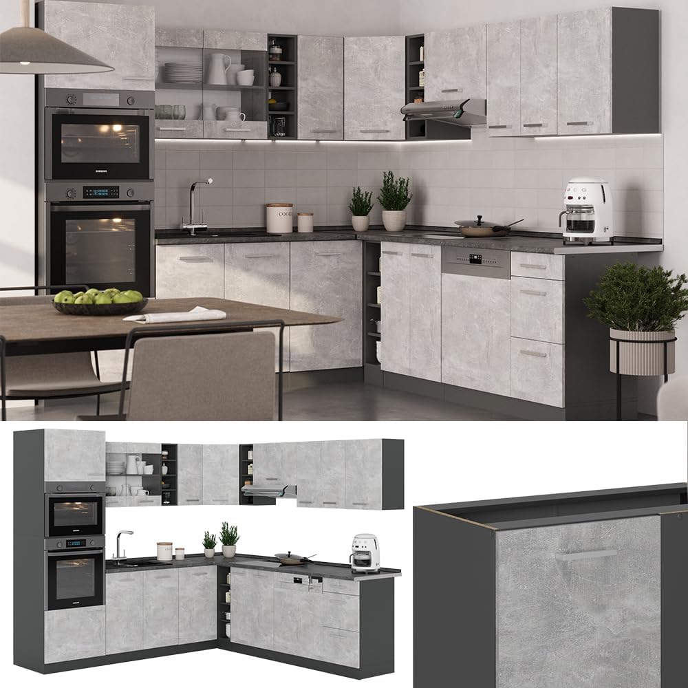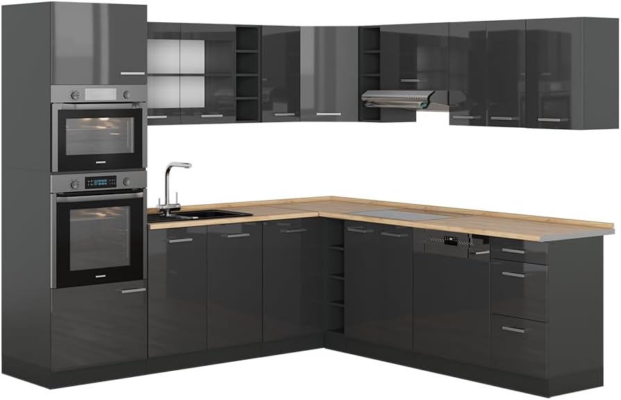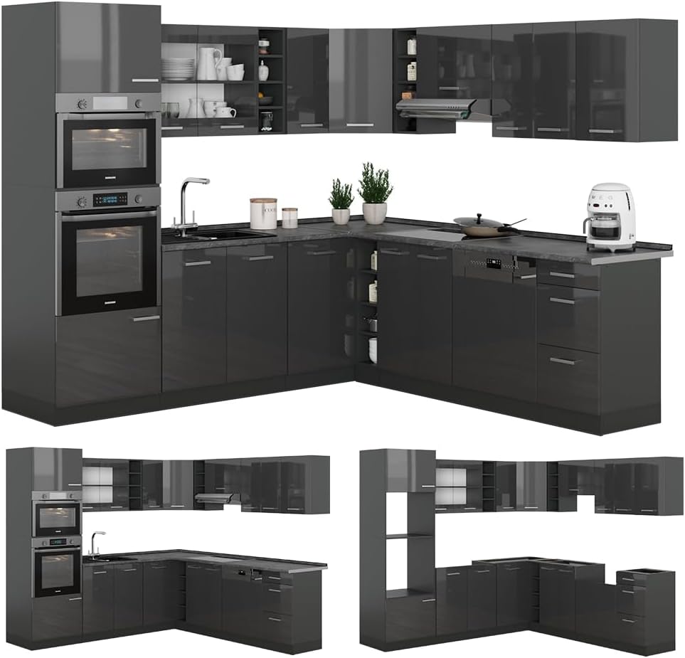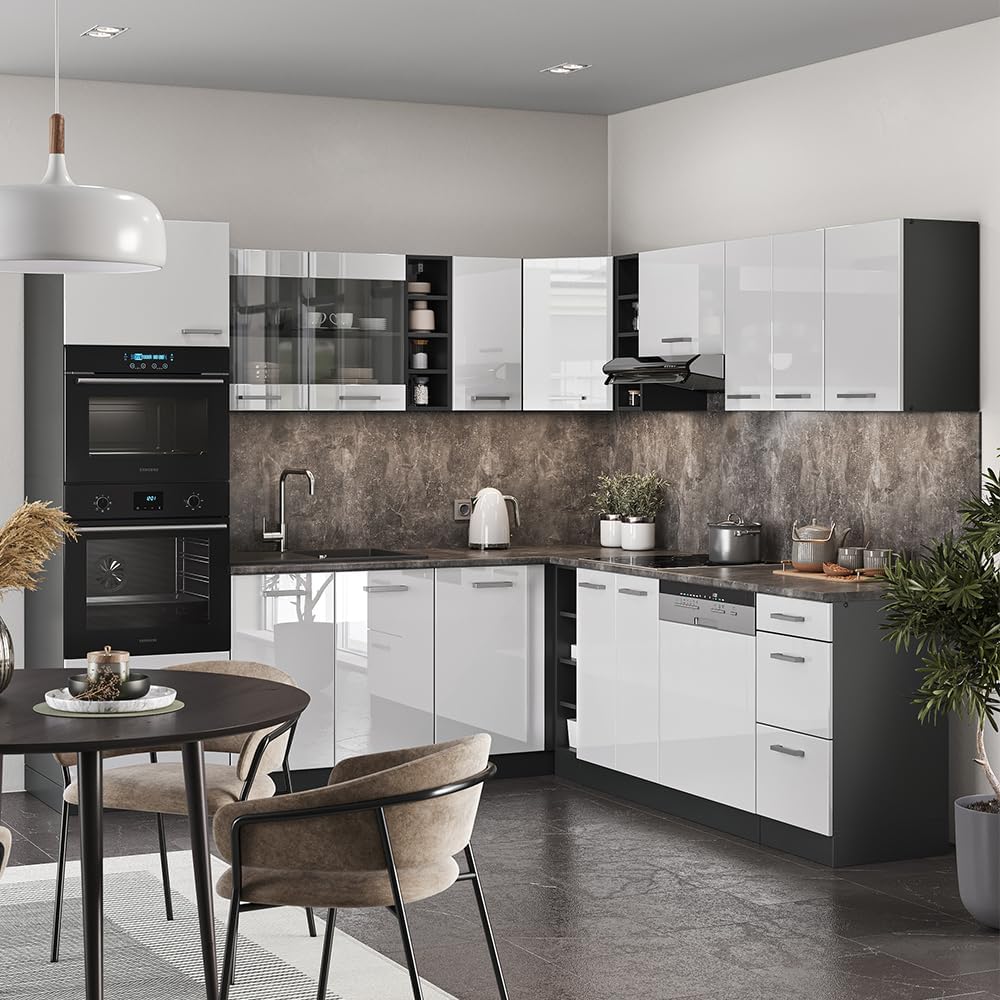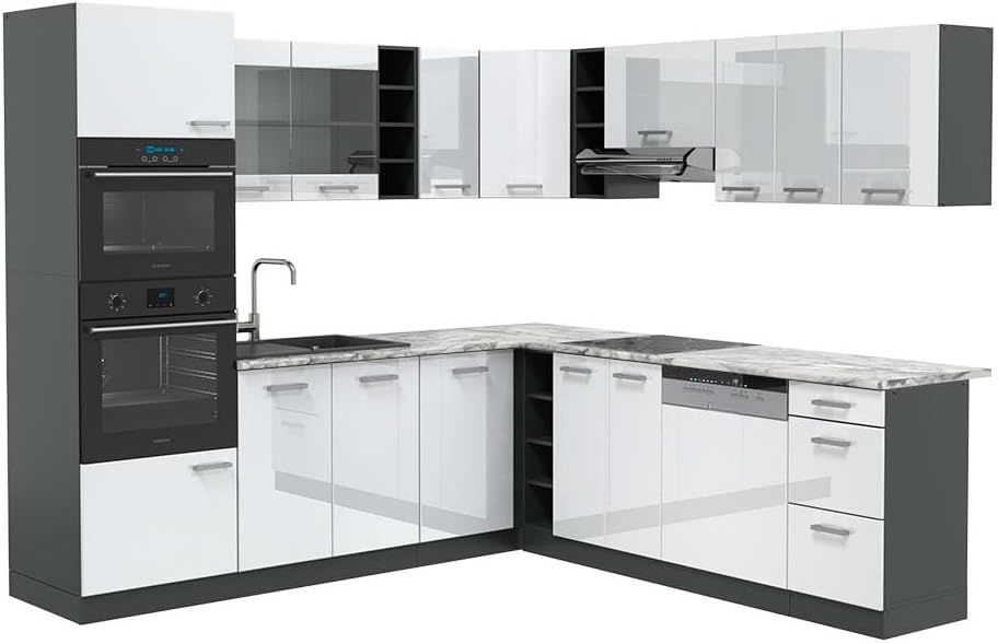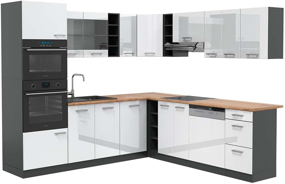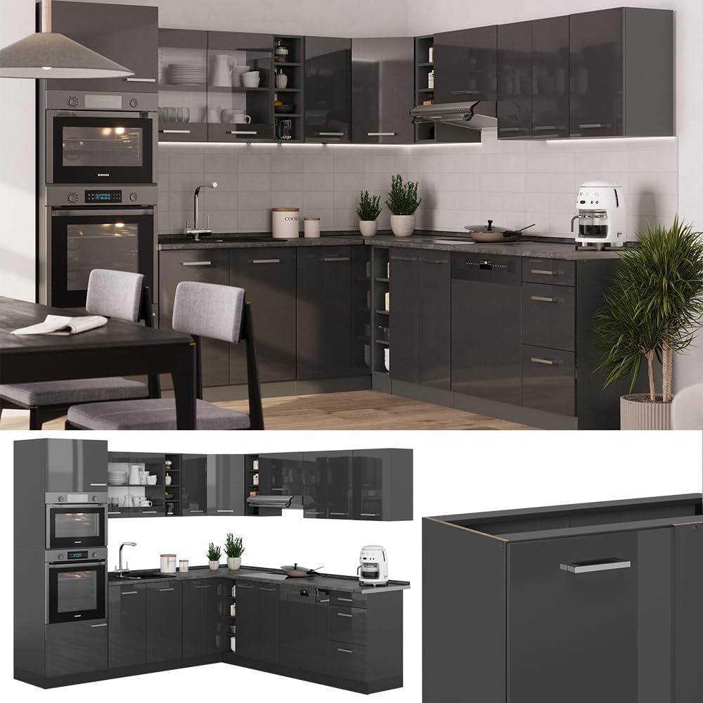 Vicco R-Line Fitted Kitchen Cabinets Anthracite Kitchen Furniture (Anthracite / White High Gloss, Corner 247 x 237 cm)