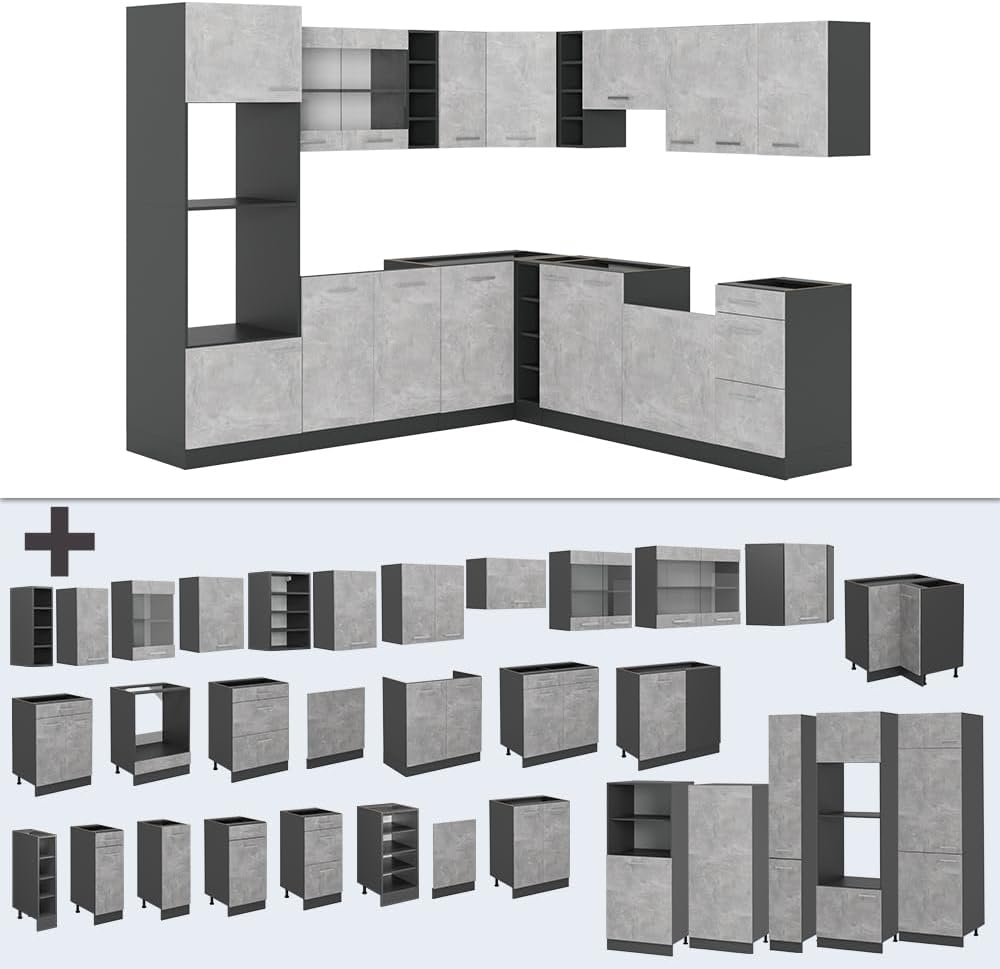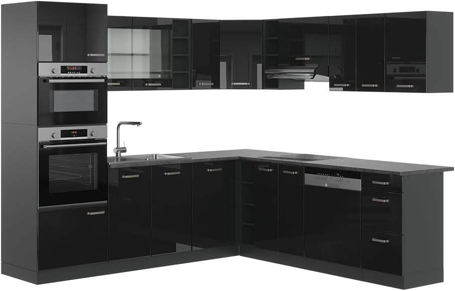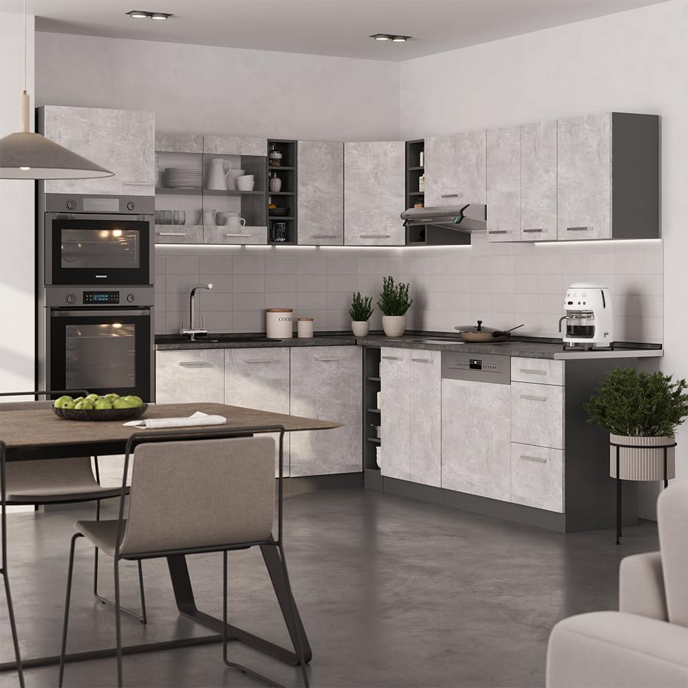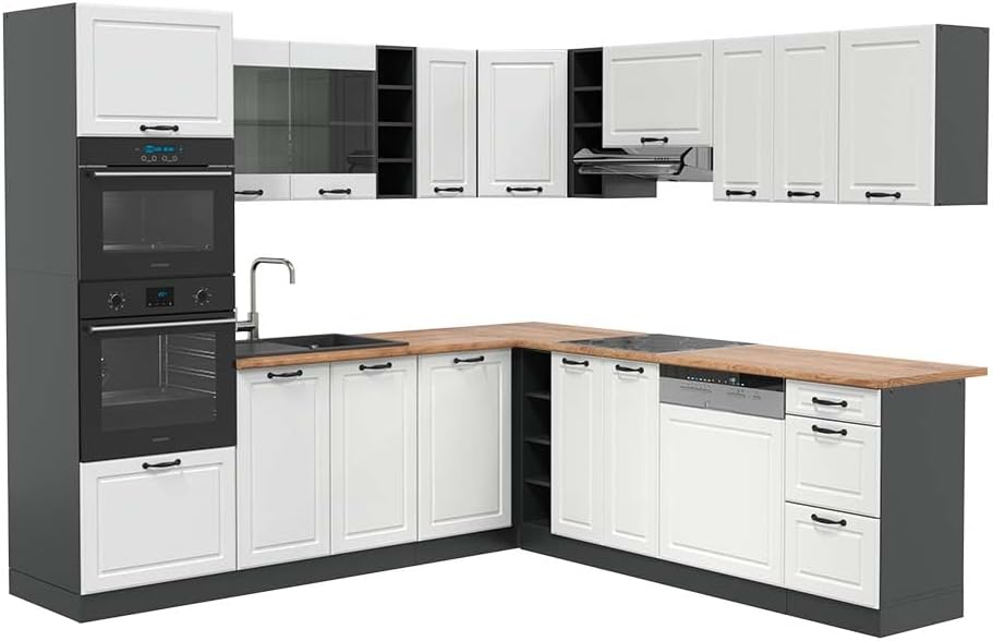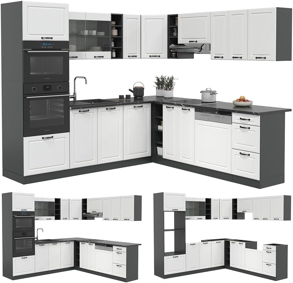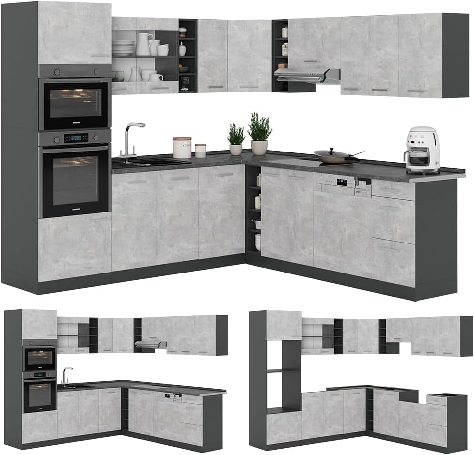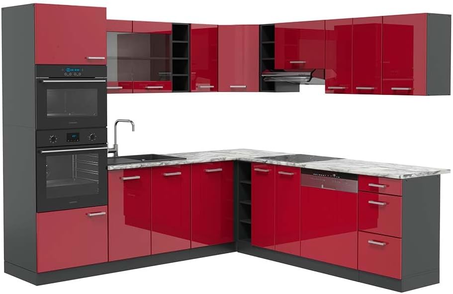Vicco R-Line Fitted Kitchen Cabinets Anthracite Kitchen Furniture (Anthracite / White High Gloss, Corner 247 x 237 cm)