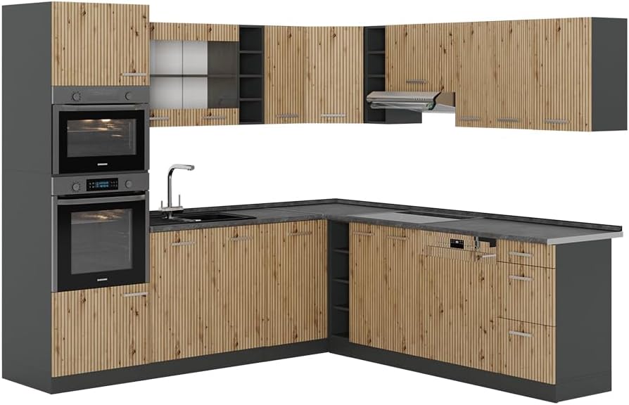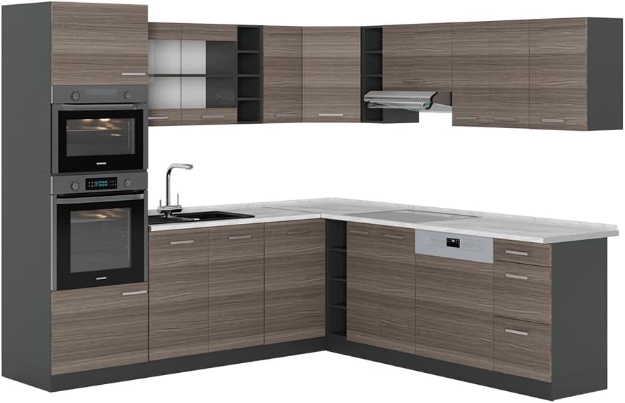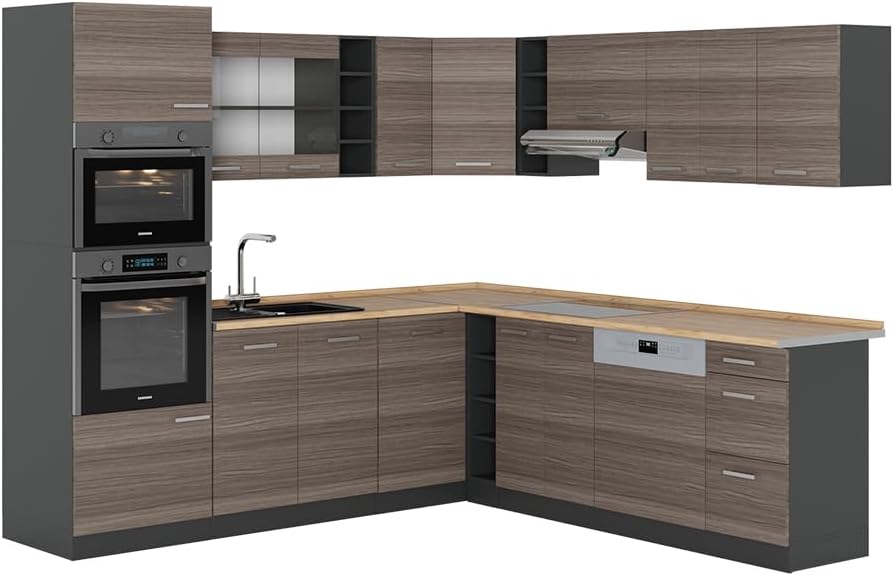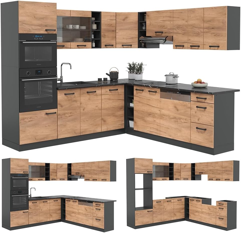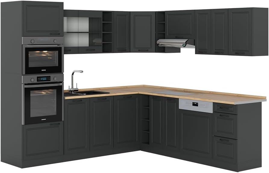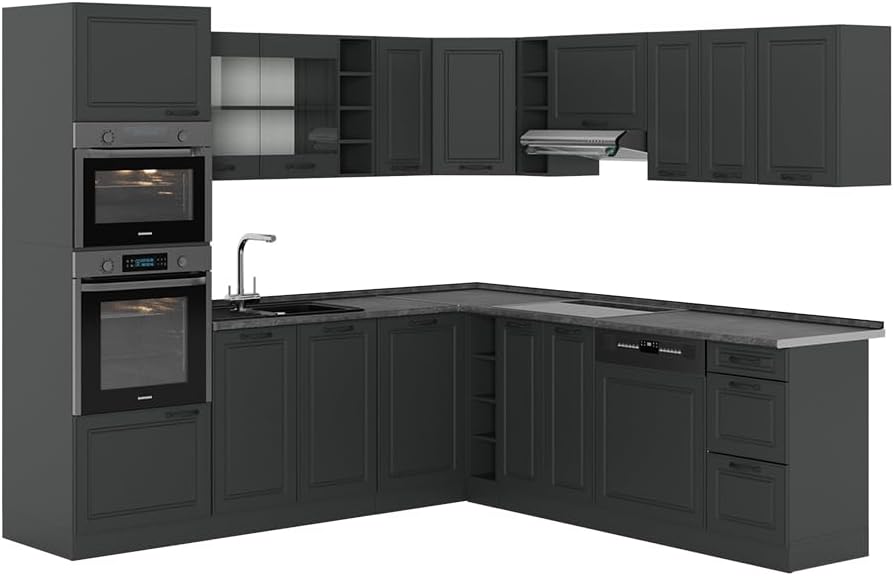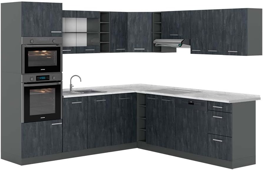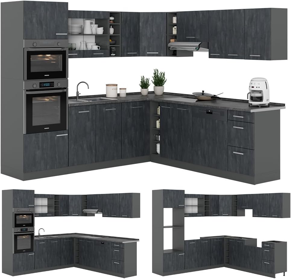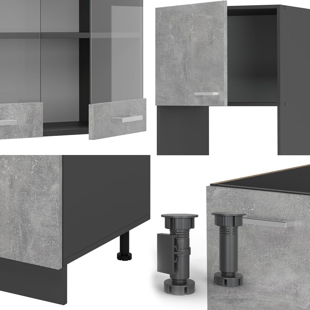 Vicco R-Line Fitted Kitchen Cabinets Anthracite Kitchen Furniture (Anthracite / White High Gloss, Corner 247 x 237 cm)