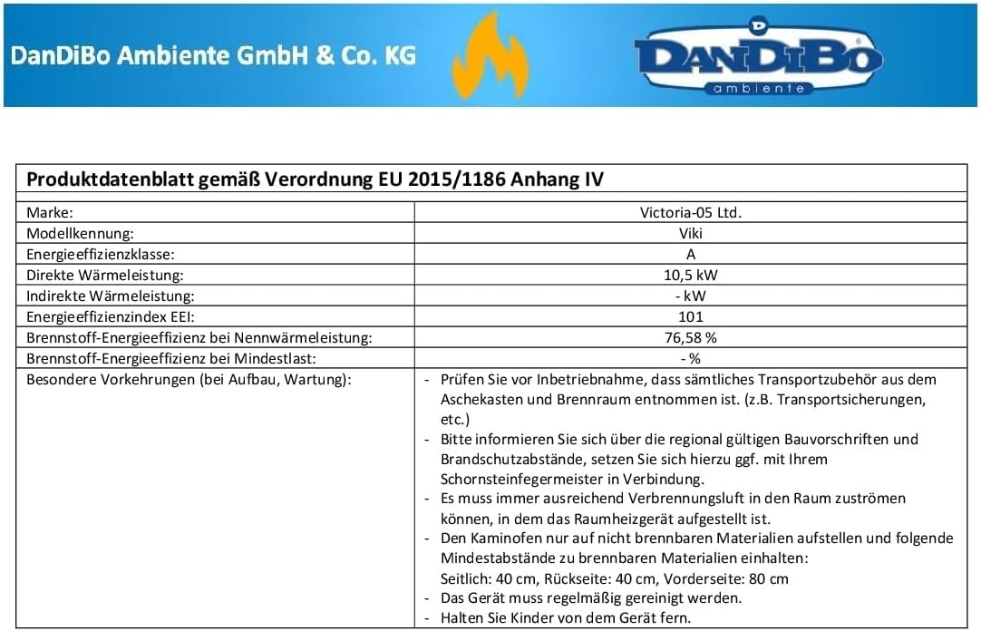 You can cook in the large baking chamber, some cooking, baking, roasting or even steaming. Can also be used as a pizza oven or for preparing cakes, pastries or hot desserts. Thanks to the handle above the baking compartment, you can adjust the temperature in the baking compartment as desired. The cast iron hotplate can be removed to fry or cook directly over the flame, e.g. with a wok cooking and baking without the use of electricity or gas. Fireclay lined combustion chamber Integrated viewing window. Removable ash compartment. The construction of Viki stoves allows precise control of temperature intensity and easy combustion and ash cleaning. The state-of-the-art draught control allows the user to quickly control fire intensity. Includes heat-resistant glove and instruction manual in German. Technical data: - Overall dimensions: width 93 cm, height 87.4 cm, depth 62.6 cm, combustion chamber: width 22 cm, height 37 cm, depth 45.4 cm, baking compartment: width 40.5 cm, height 21.5 cm, depth 49 cm - diameter flue pipe: diameter 150 mm - weight: 122 kg - colour: black. Stainless steel / Stainless steel / Stainless Distance to flammable materials from the side: 40 cm - Minimum distance from flammable materials from the back: 40 cm - Minimum distance to flammable materials from the front: 80 cm - 10.5 kW nominal value - power range 5 - 12 kW - efficiency: 76.58 % - exhaust gas temperature: 188 °C - Abgas massflow stream 11.90 g/s - dust emission to 13% O2: 38.1 mg/Nm3 - CO emission to 13% O2: 0.1157 mg/Nm3 - NOx emission at 13% O2: 88.64 mg/Nm3 - OGC emission at 13% O2: 41.50 mg/Nm3 - Minimum discharge pressure: 12 Pa - Energy efficiency class: A - Suitable burning 1. Wood, wooden briquettes - meets BImSchV level 2 for Germany, as well as the 15A-BVG for Austria. - Multiple occupancy is possible as the combustion chamber opening is smaller than 500 cm2. - Delivered by freight forwarder, free kerbside.