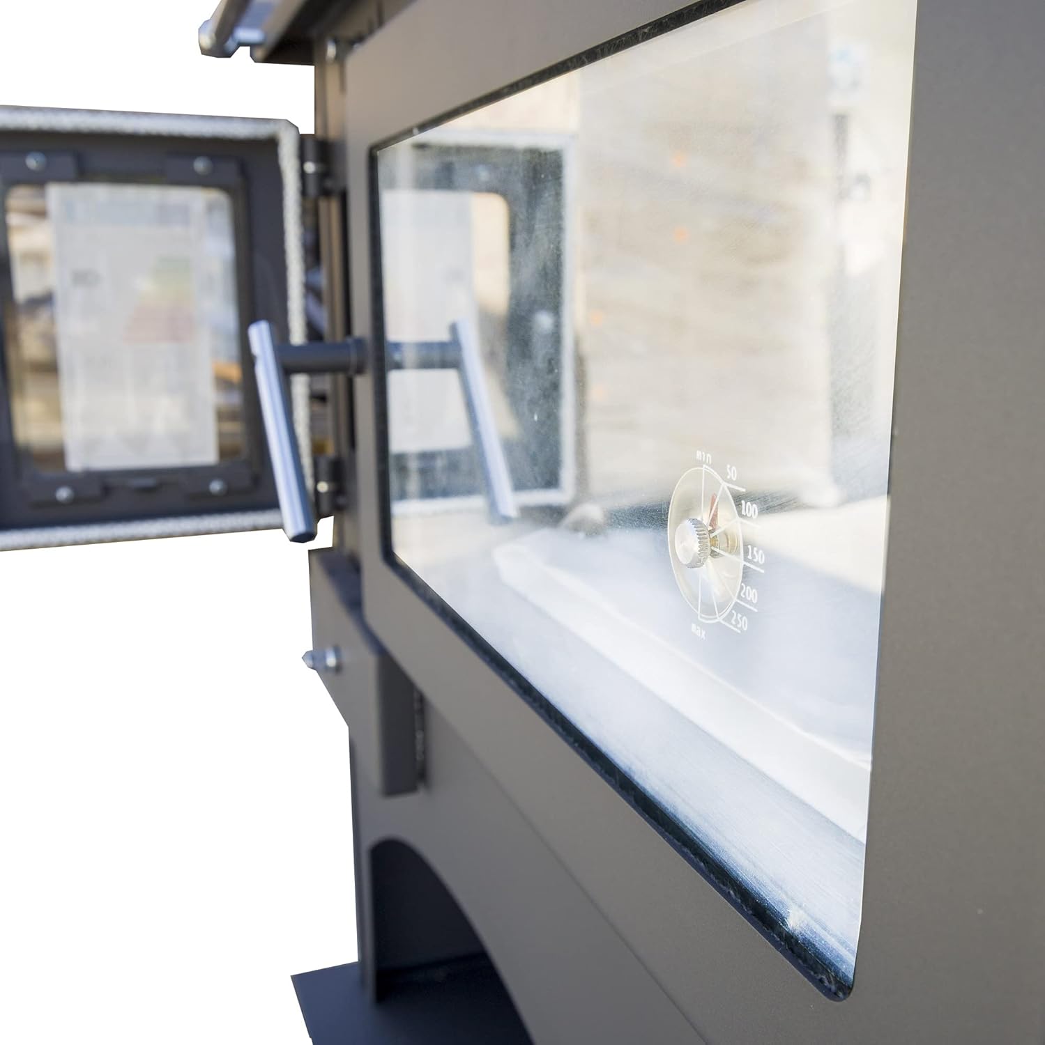 - Thanks to the handle above the baking compartment, you can adjust the temperature in the baking compartment as desired. To control the temperature in the oven, a thermometer is attached to the pane. The cast iron hotplate can be removed to fry or cook directly over the flame, e.g. with a wok. Cook and bake without the use of electricity or gas.