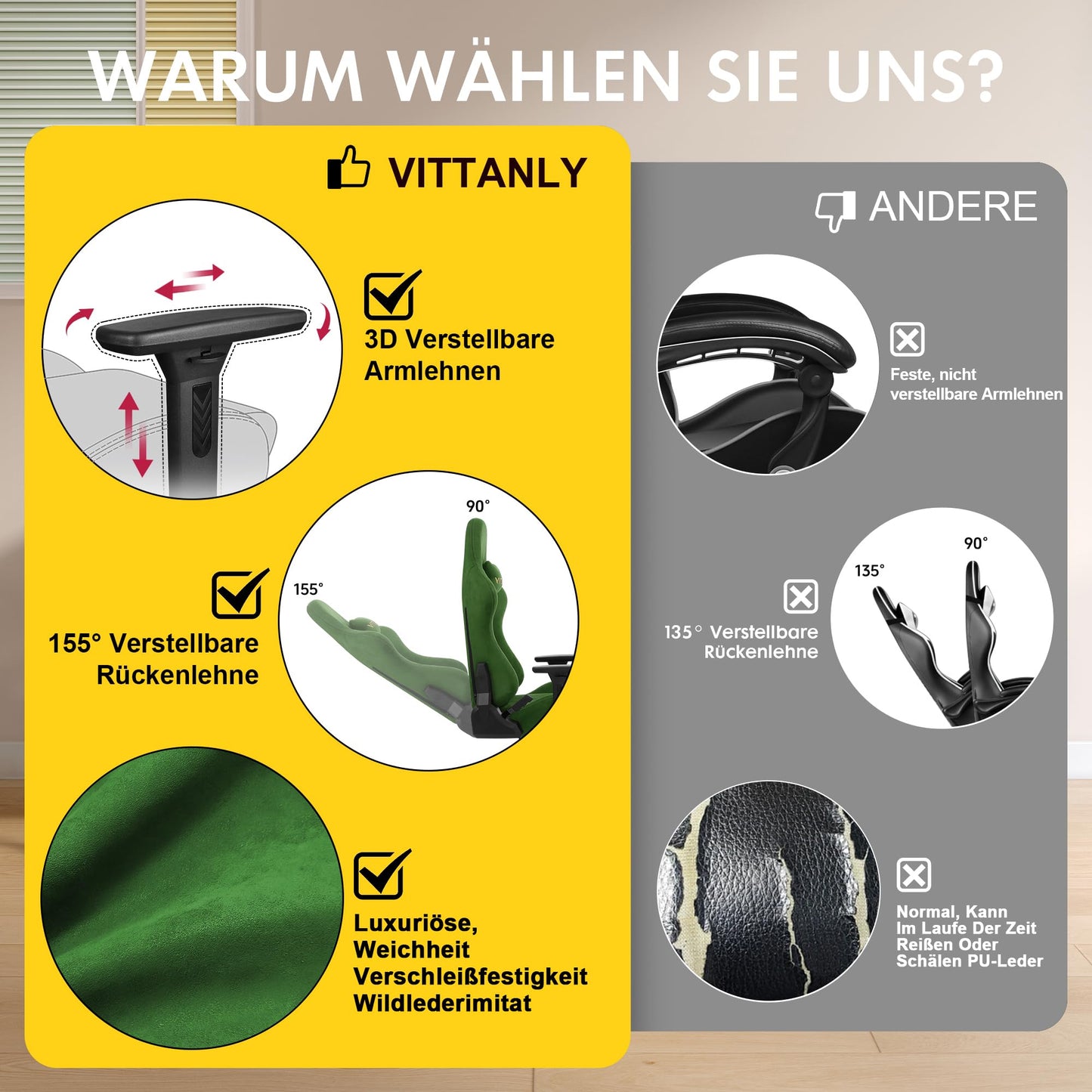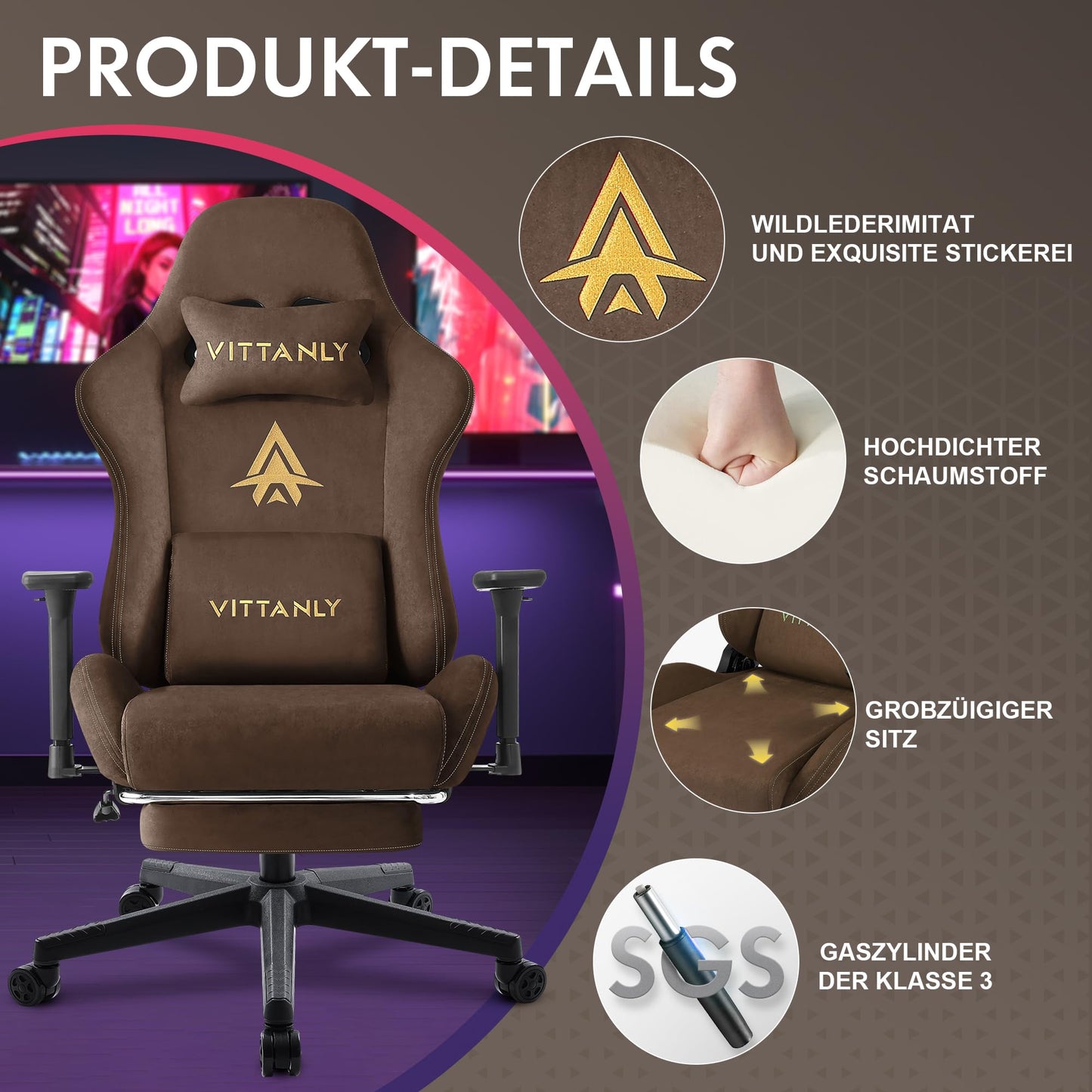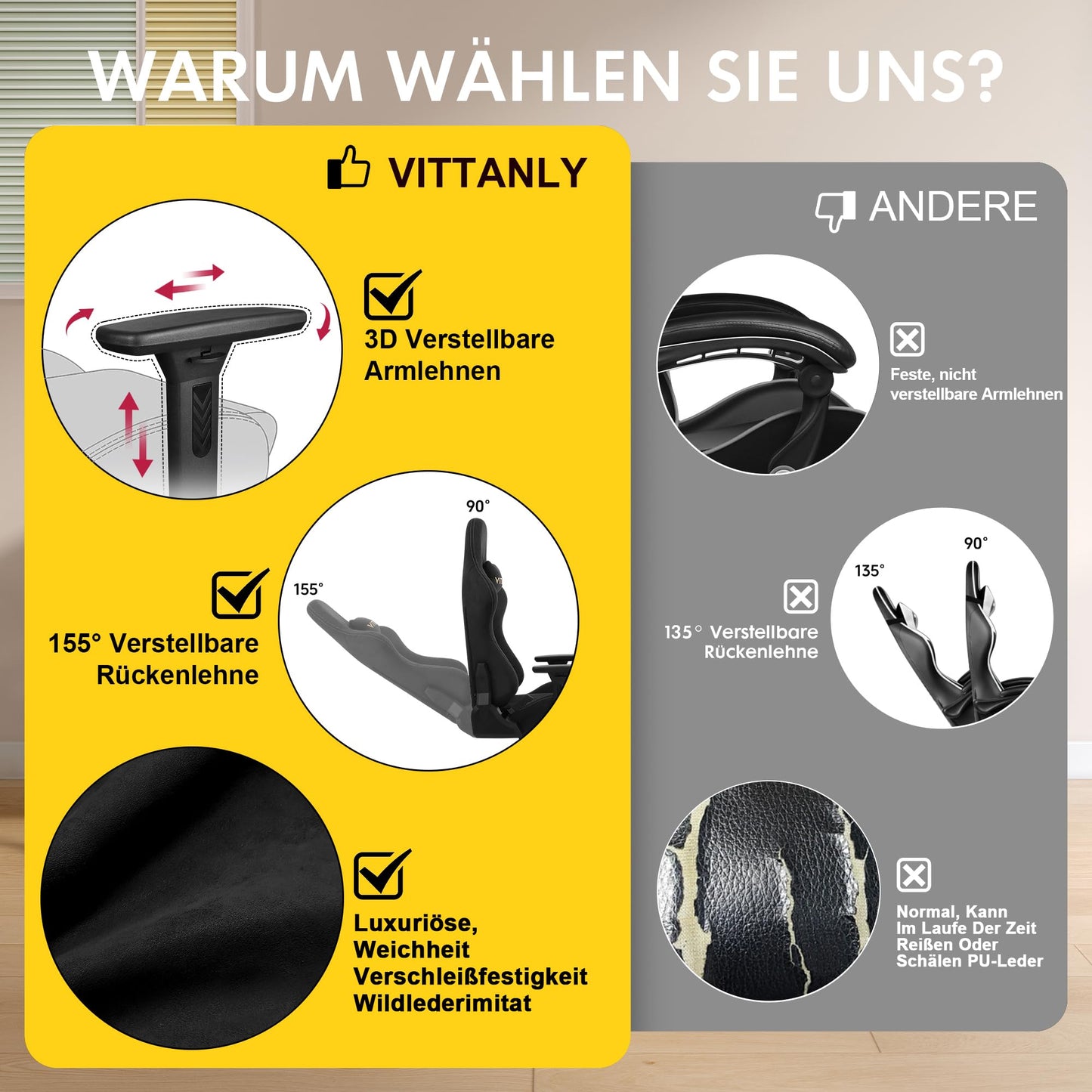 - 【Ausgezeichnetes Material】Der VITTANLY Gaming-Stuhl ist aus hochwertigem Wildlederimitat gefertigt, dem Innenraumgewebe von Luxusautos sehr nahe kommt. Das Material ist strapazierfähig und verschleißfest, weich und bequem. Im Vergleich zu Leder ist es atmungsaktiver, was Sie im Winter warm hält und im Sommer das Schwitzen minimiert. Zusammen mit dem 10 cm dicken Sitzkissen aus hochdichtem Schaumstoff sorgt dies für ein komfortables Erlebnis, perfekt für stundenlanges Spielen und Arbeiten.