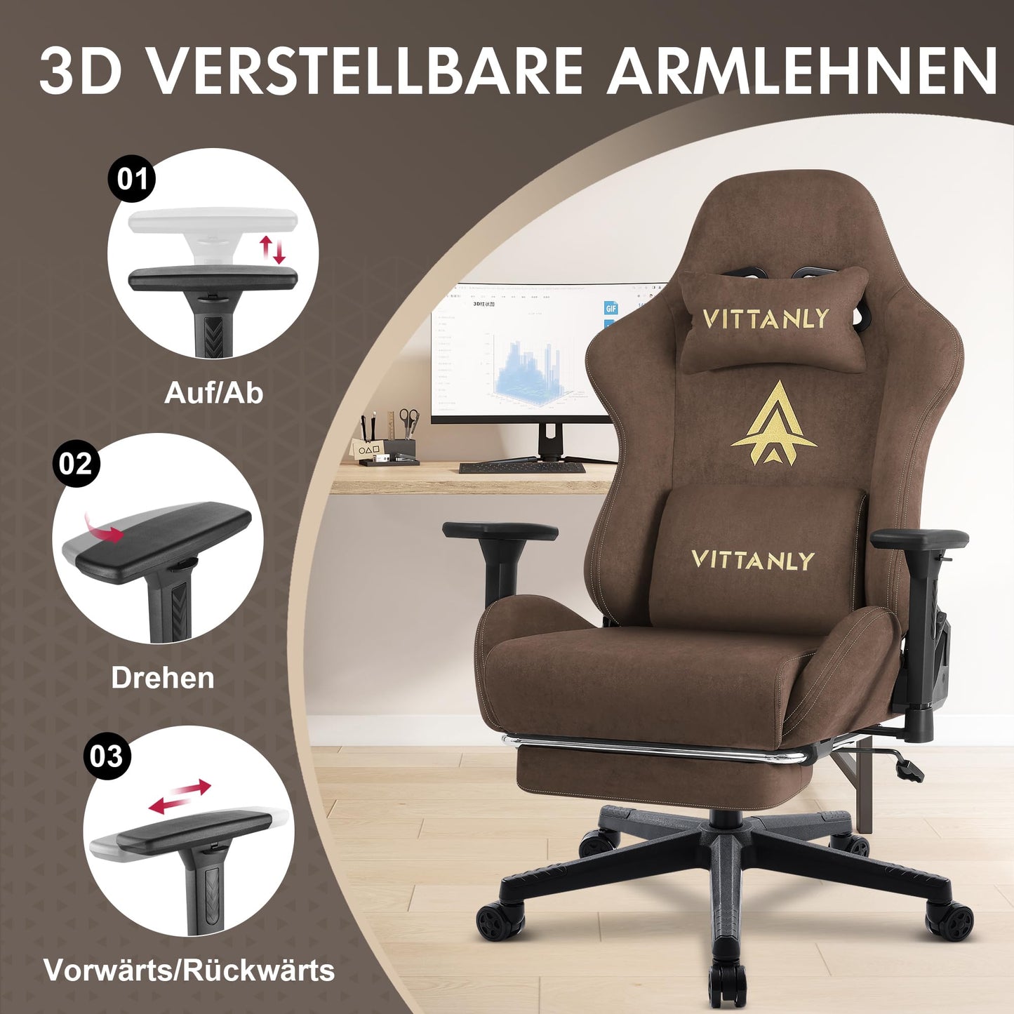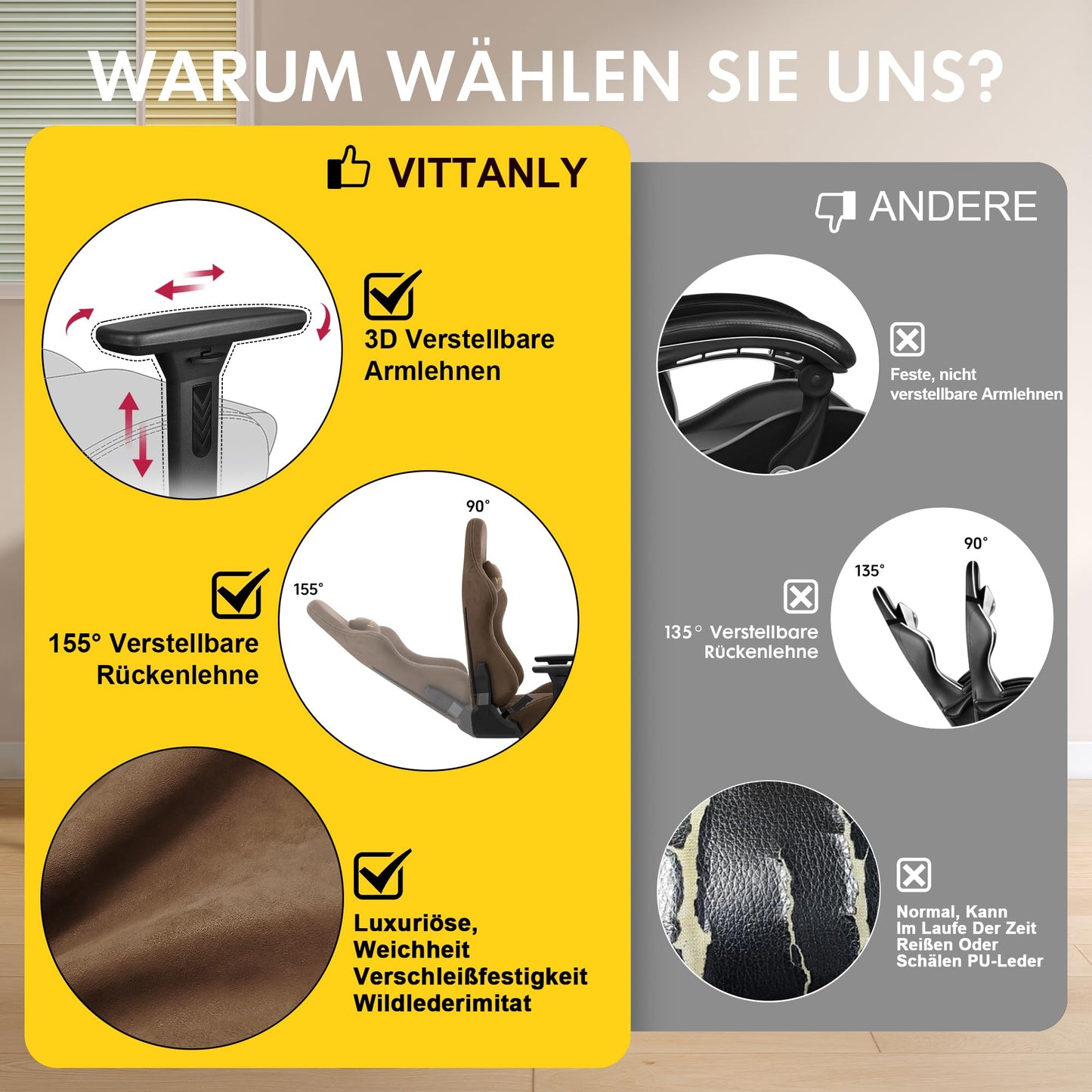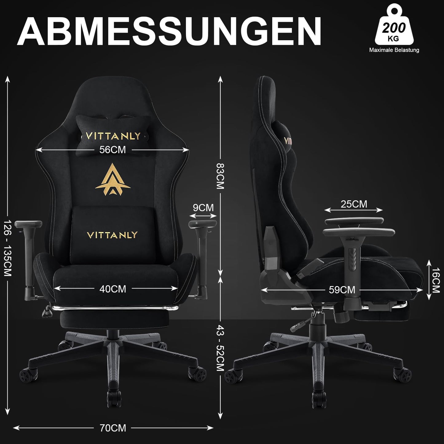 - 【Ausgezeichnetes Material】Der VITTANLY Gaming-Stuhl ist aus hochwertigem Wildlederimitat gefertigt, dem Innenraumgewebe von Luxusautos sehr nahe kommt. Das Material ist strapazierfähig und verschleißfest, weich und bequem. Im Vergleich zu Leder ist es atmungsaktiver, was Sie im Winter warm hält und im Sommer das Schwitzen minimiert. Zusammen mit dem 10 cm dicken Sitzkissen aus hochdichtem Schaumstoff sorgt dies für ein komfortables Erlebnis, perfekt für stundenlanges Spielen und Arbeiten.