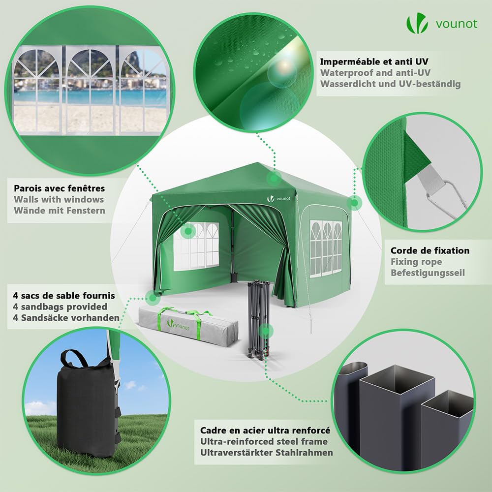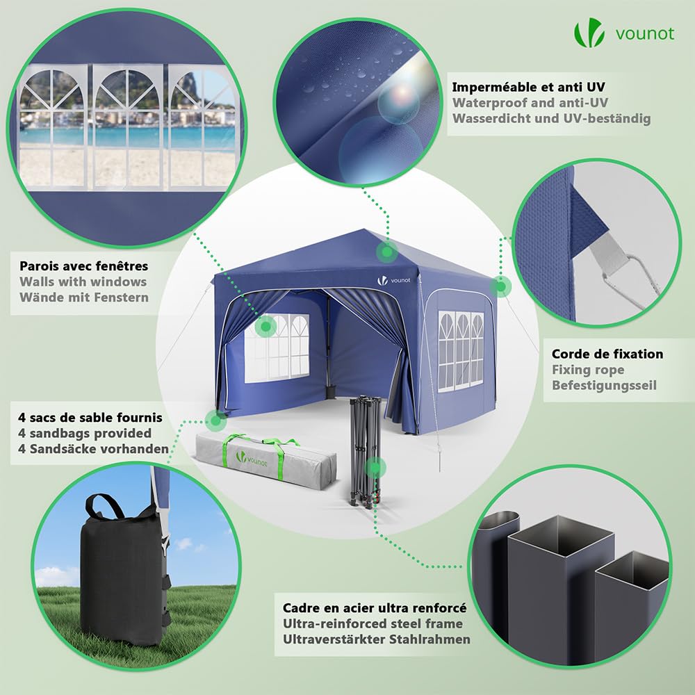 - Stable and durable: with a reinforced metal frame, this gazebo offers excellent stability and durability, even in difficult conditions. Included are 4 sandbags, 4 guy ropes and 11 pegs for reliable outdoor anchoring.