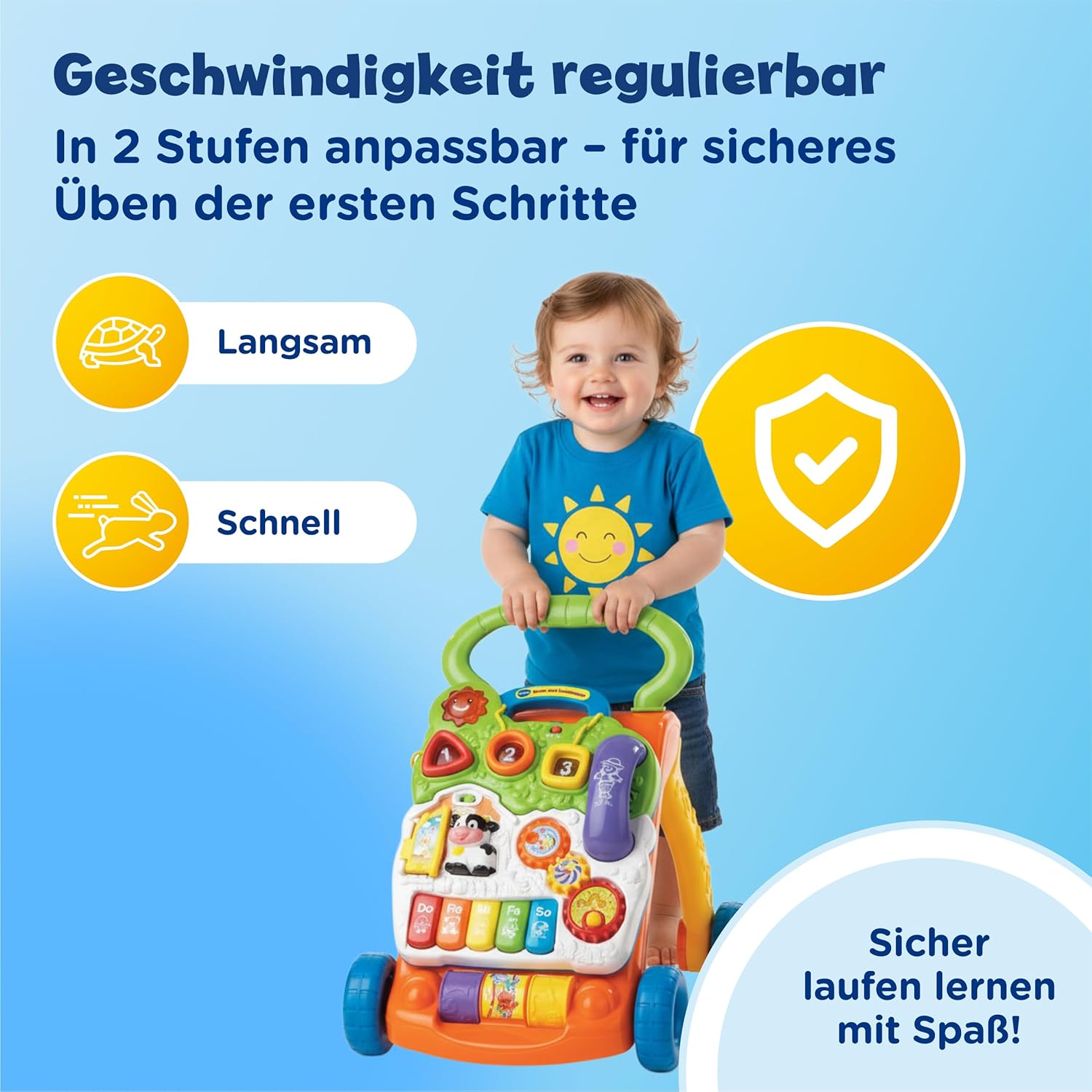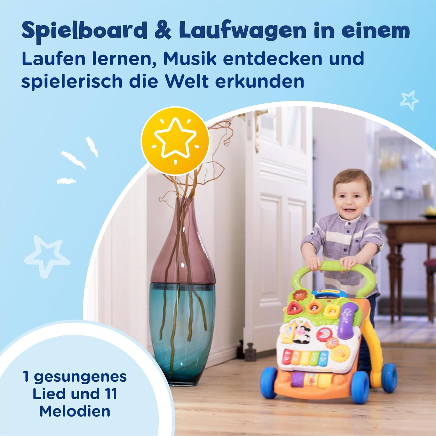 - Box contents: 1 x Vtech baby play and running trolley, game console and trolley in one, German version, 2 x AA demo batteries, developed and tested by educators, item number: 80-077066