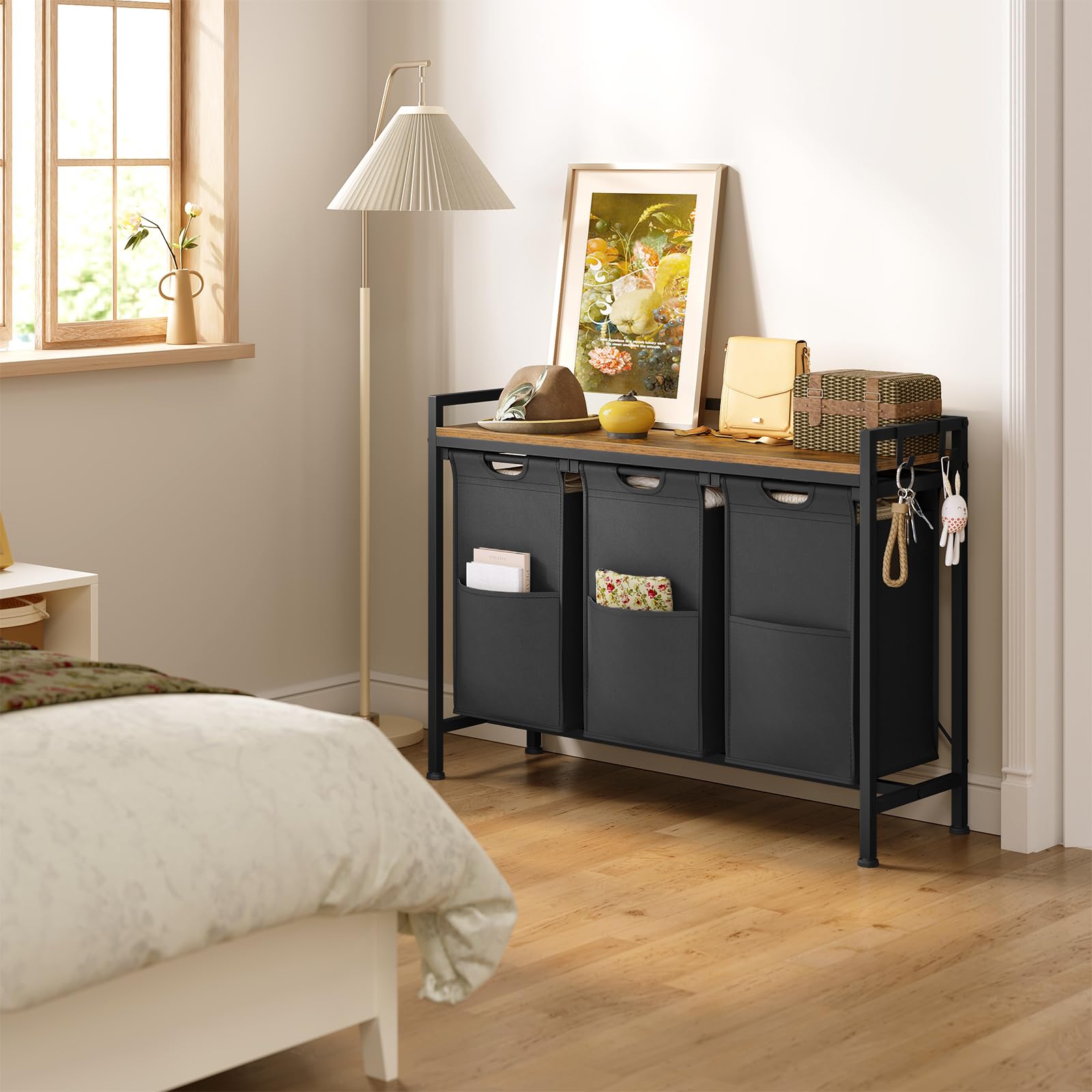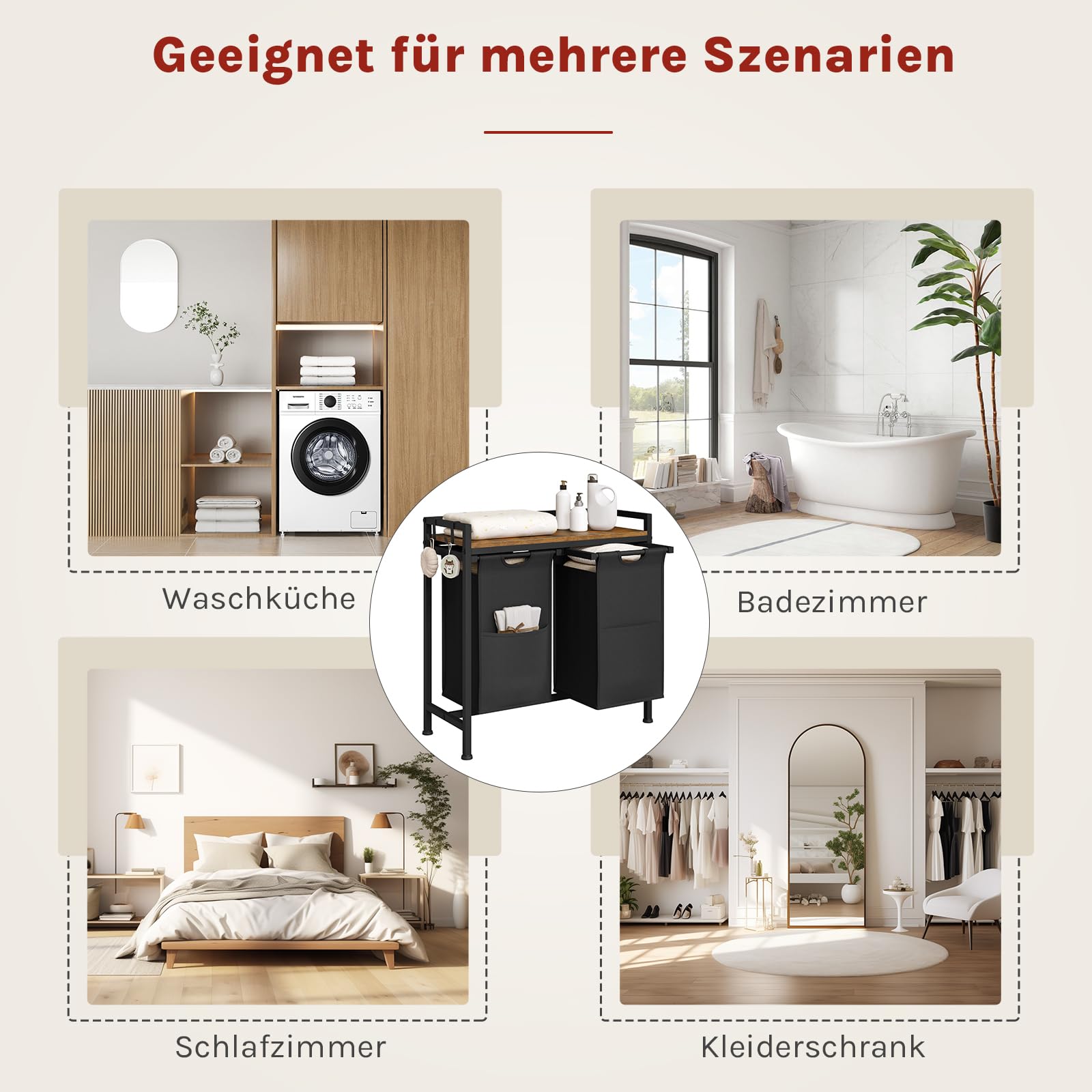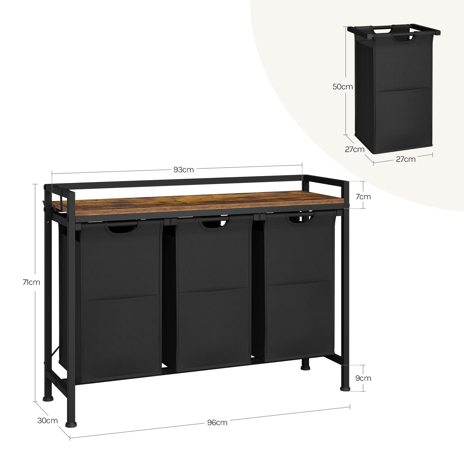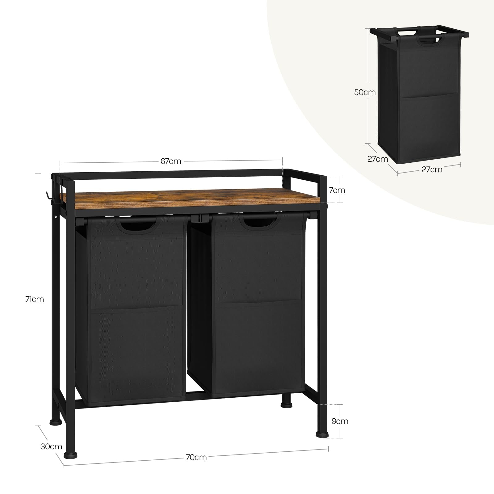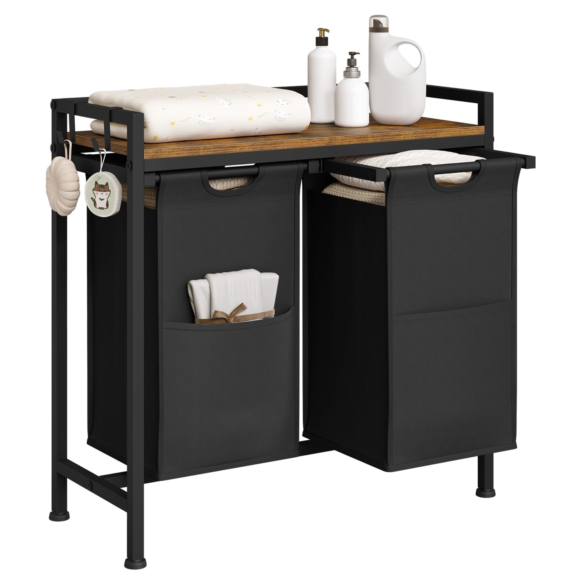- VERSATILE The perfect combination of metal and wood adds a modern and industrial touch to the bathroom shelf with laundry baskets, so this laundry sorter can fit in your laundry room, bathroom, bedroom, dressing room, etc