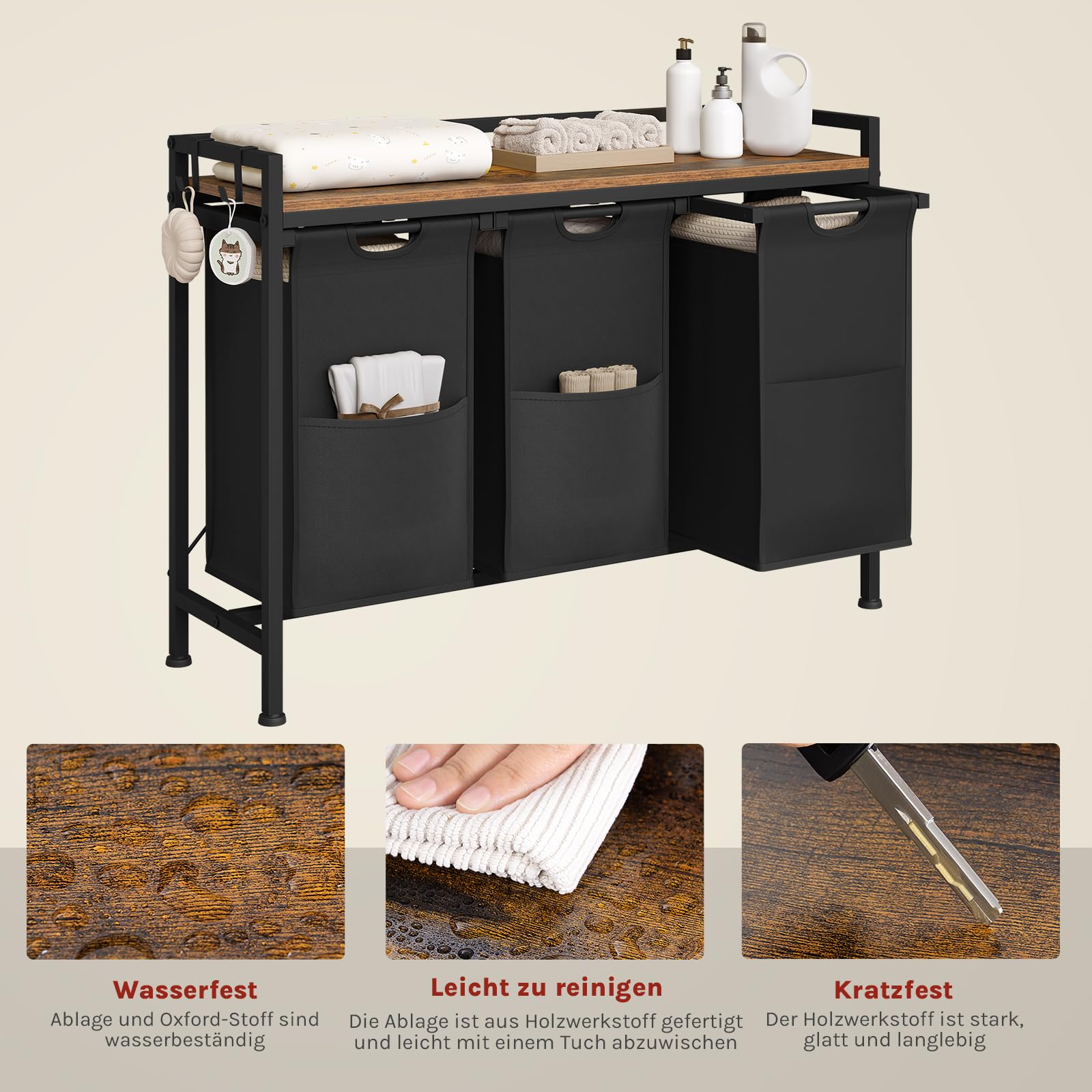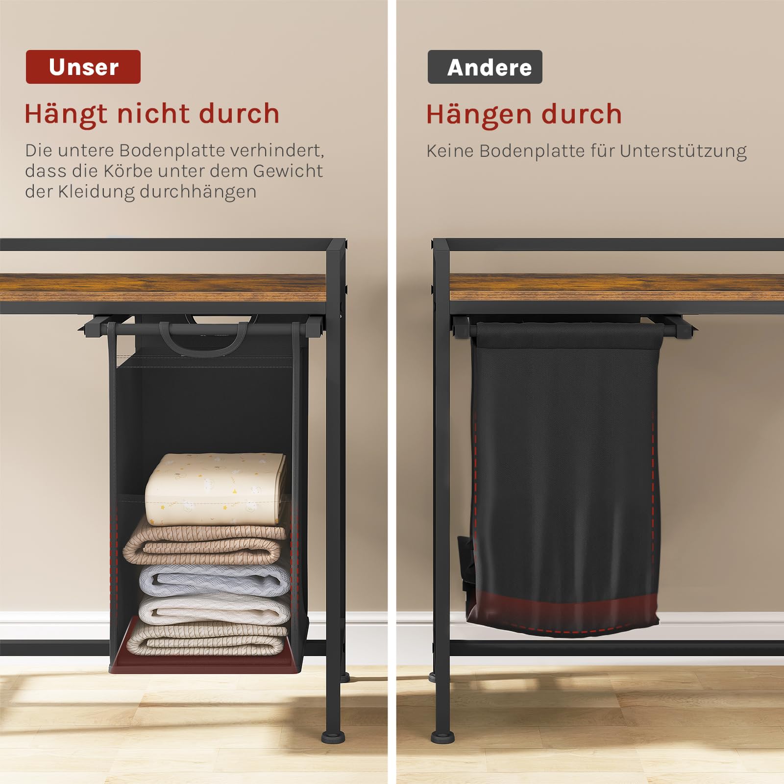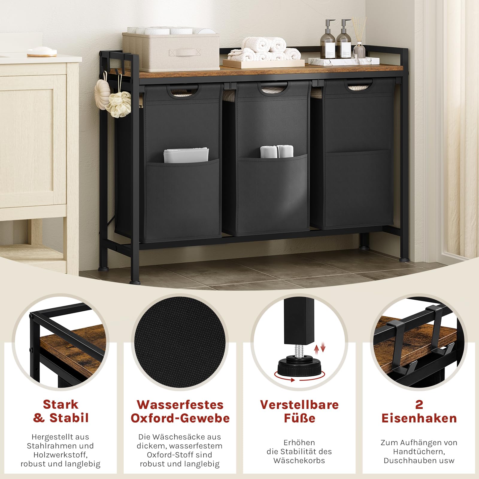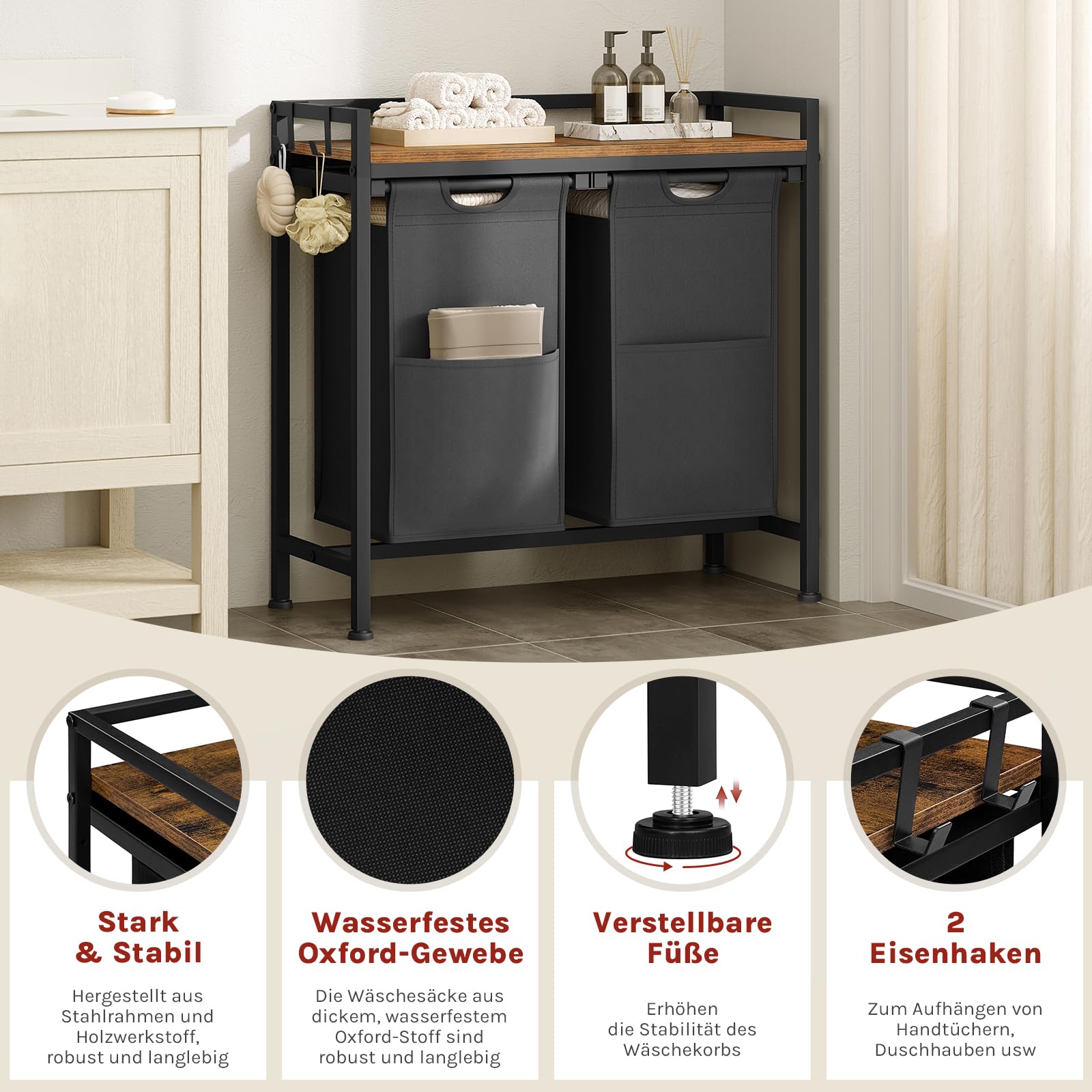 - Wear-resistant and durable: made of melamine veneered FSC-certified wood, powder-coated metal tubes and Oxford fabric, the laundry baskets are robust, stable, rust-proof, durable, water-repellent and easy to clean. The lower crossbar reinforces the structure and prevents the baskets from sinking. The adjustable feet ensure that the device stands stable even on uneven ground