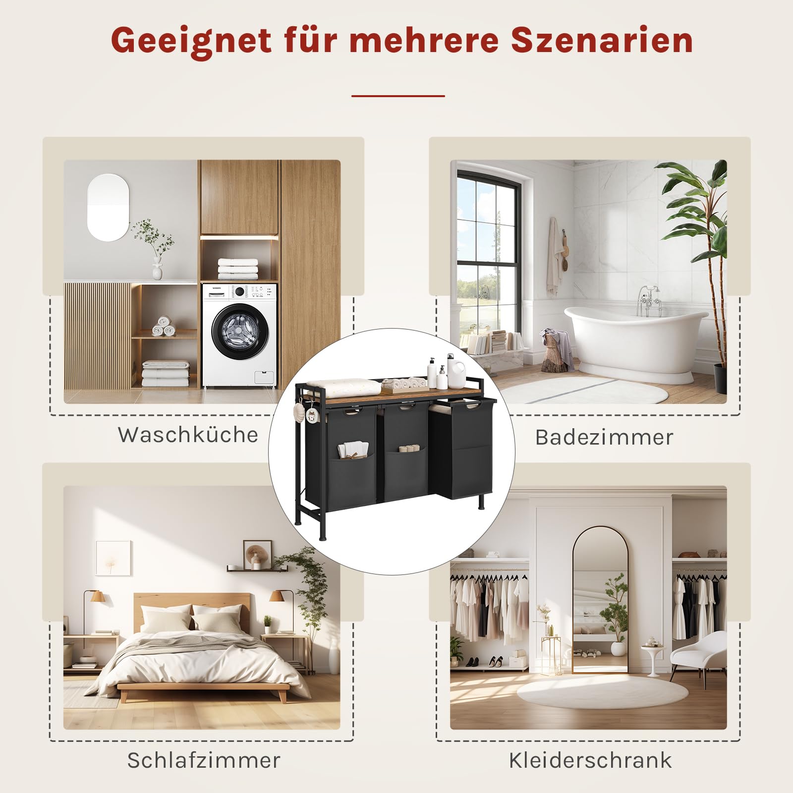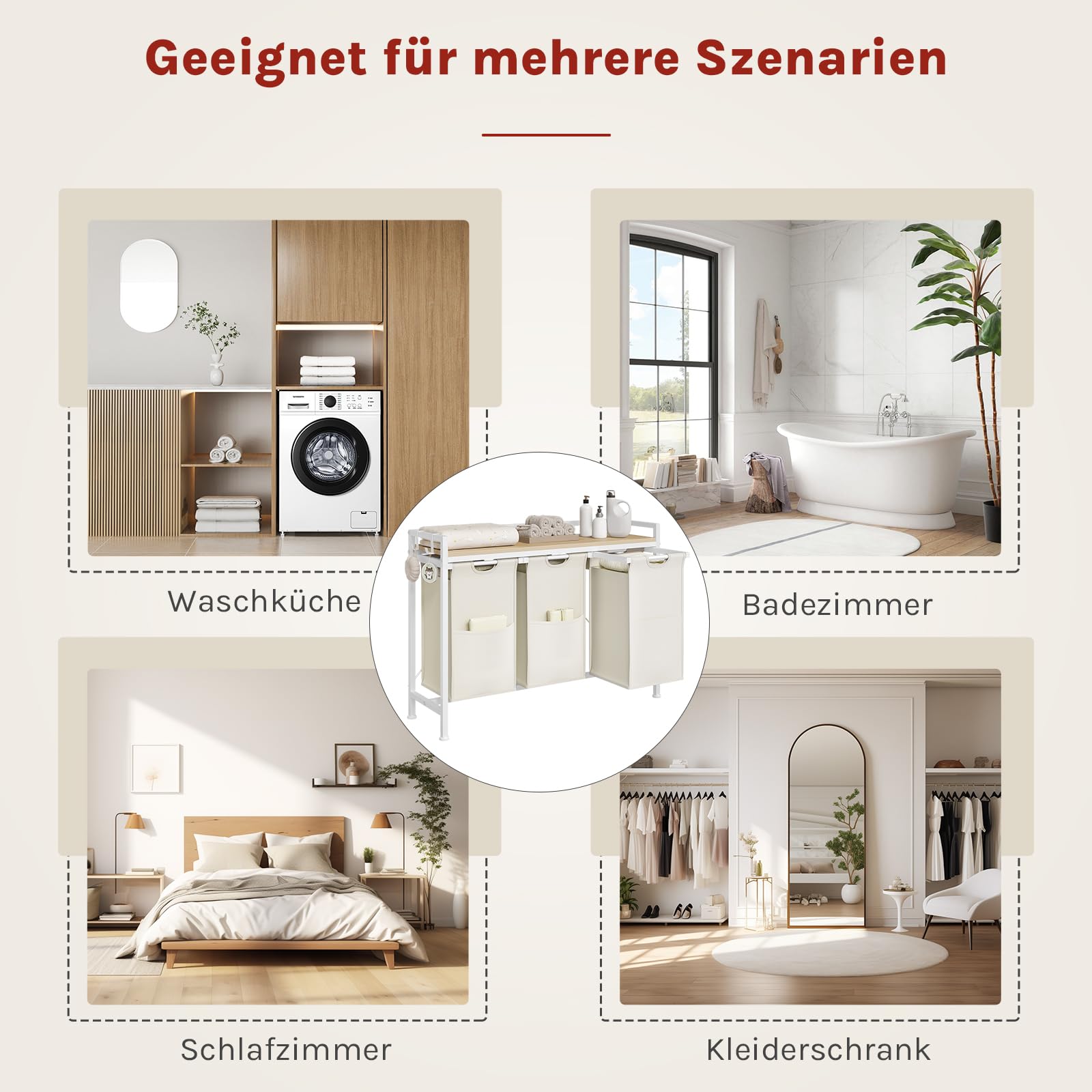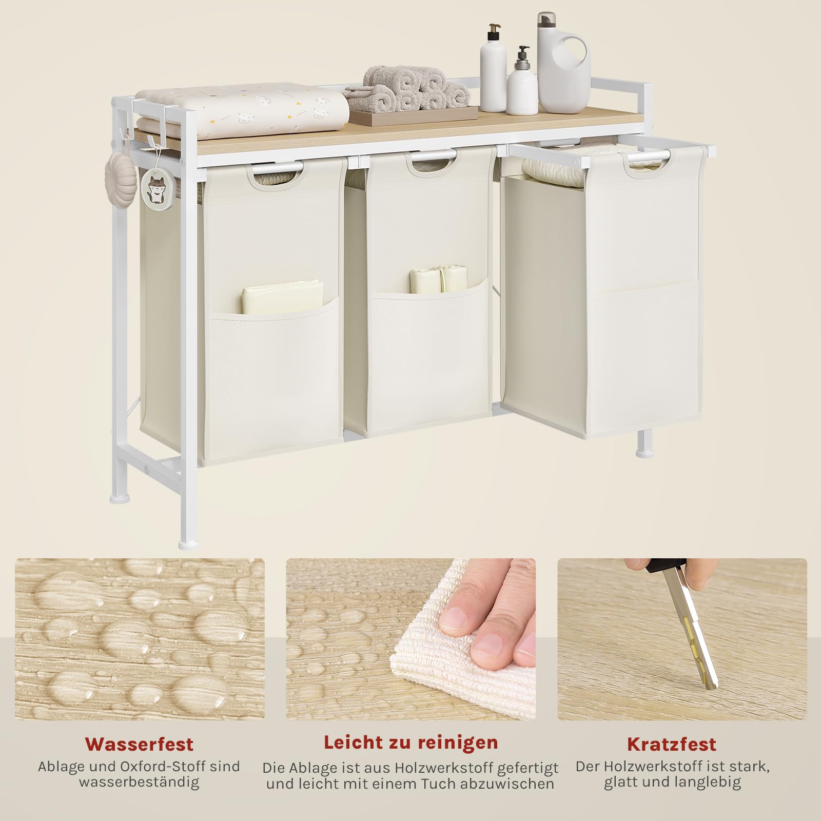 - Multifunctional laundry basket: this laundry basket has 3 compartments, 40 litres each for laundry and bedding. The worktop with a load capacity of 15 kg is ideal for detergents, toiletries etc. The 2 hooks can be hung towels or shower flowers, with a maximum load capacity of 2 kg each