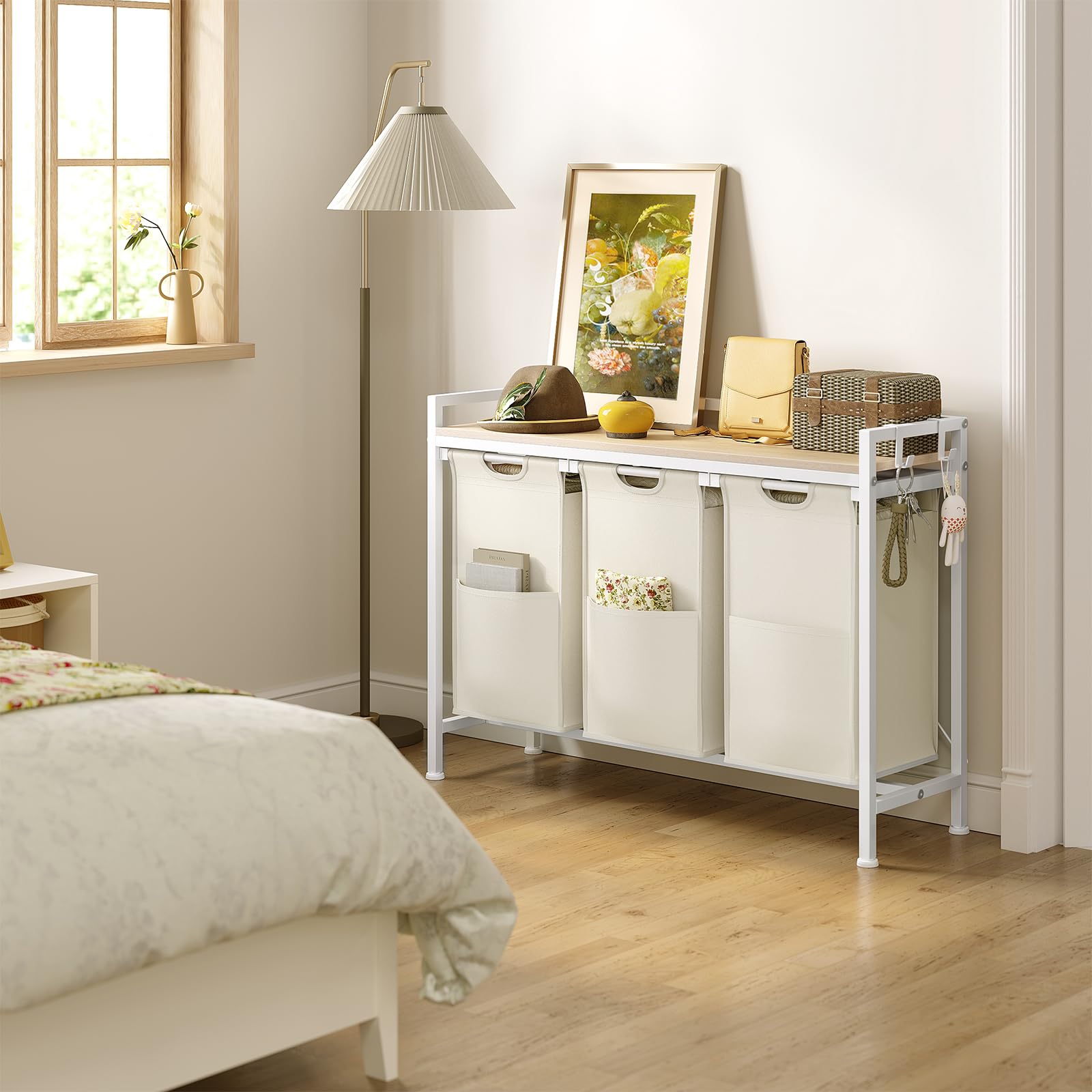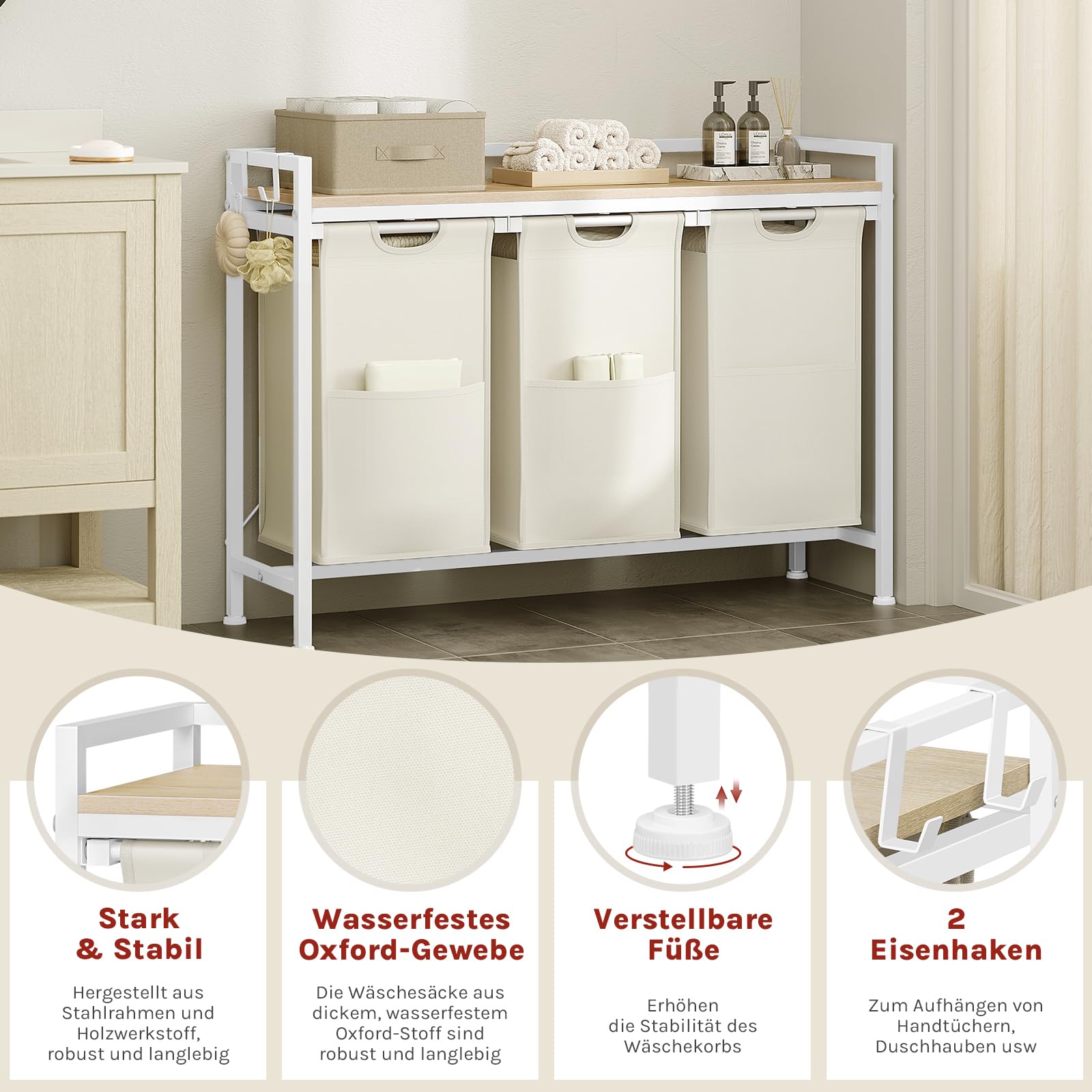 WOLTU Laundry Basket, 3 Compartments, Each 40 L, Laundry Hamper with Shelf Metal Frame, Oxford Fabric Laundry Bag, Extendable, Removable, Laundry Sorter, Laundry Container, White
