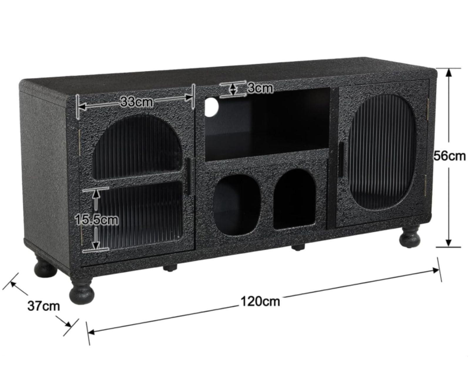 - Elegant and robust materials: this lowboard combines robustness and elegance. Made of durable wood and with two curved embossed glass doors, it adds a touch of sophistication to your decor. The solid wood base provides stability and gives the entire structure a unique look.