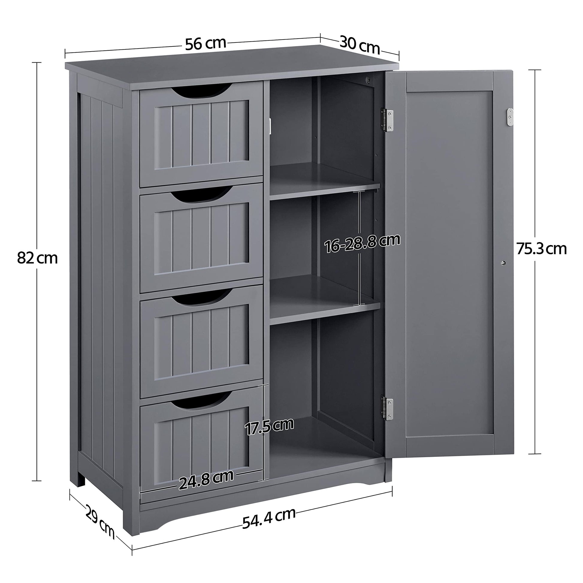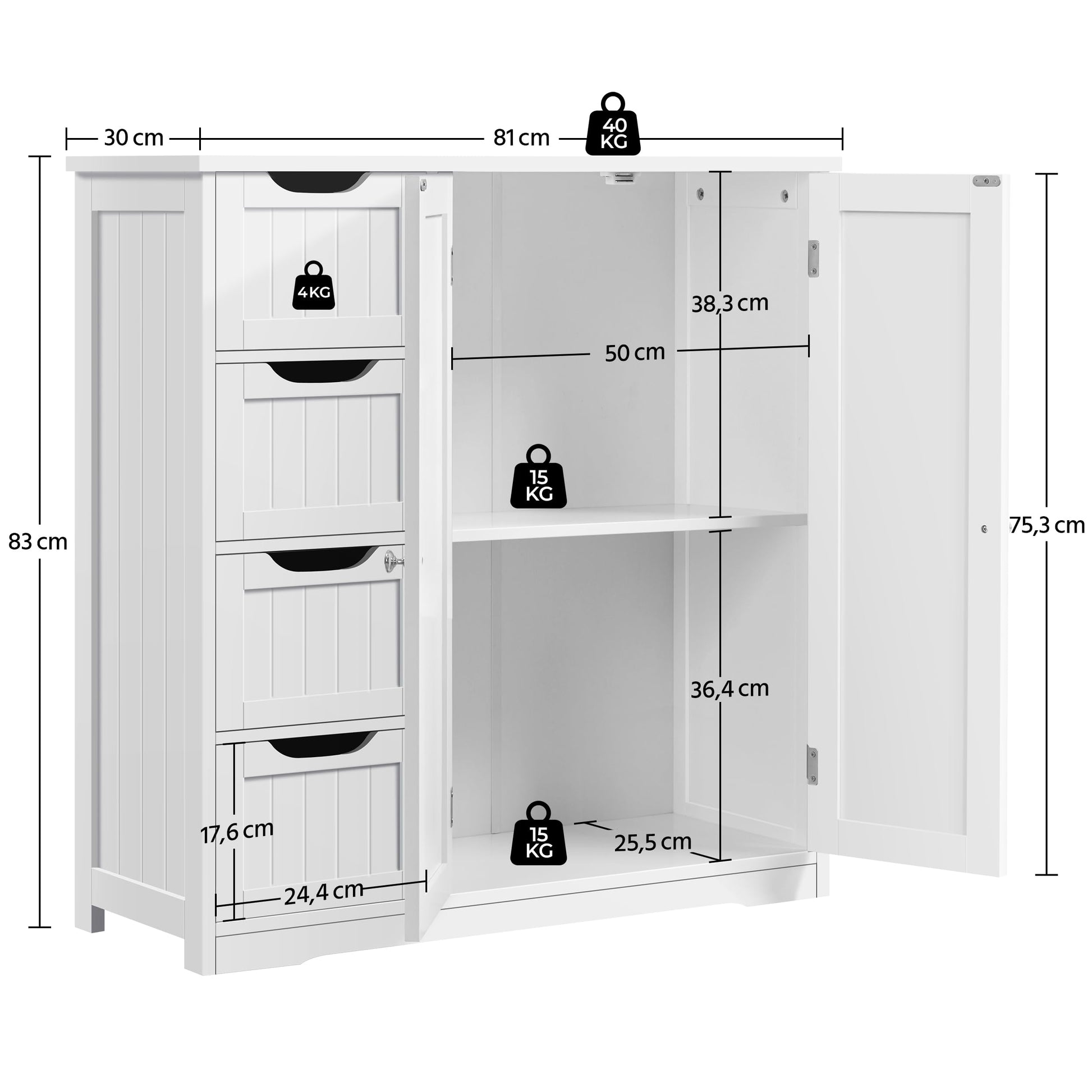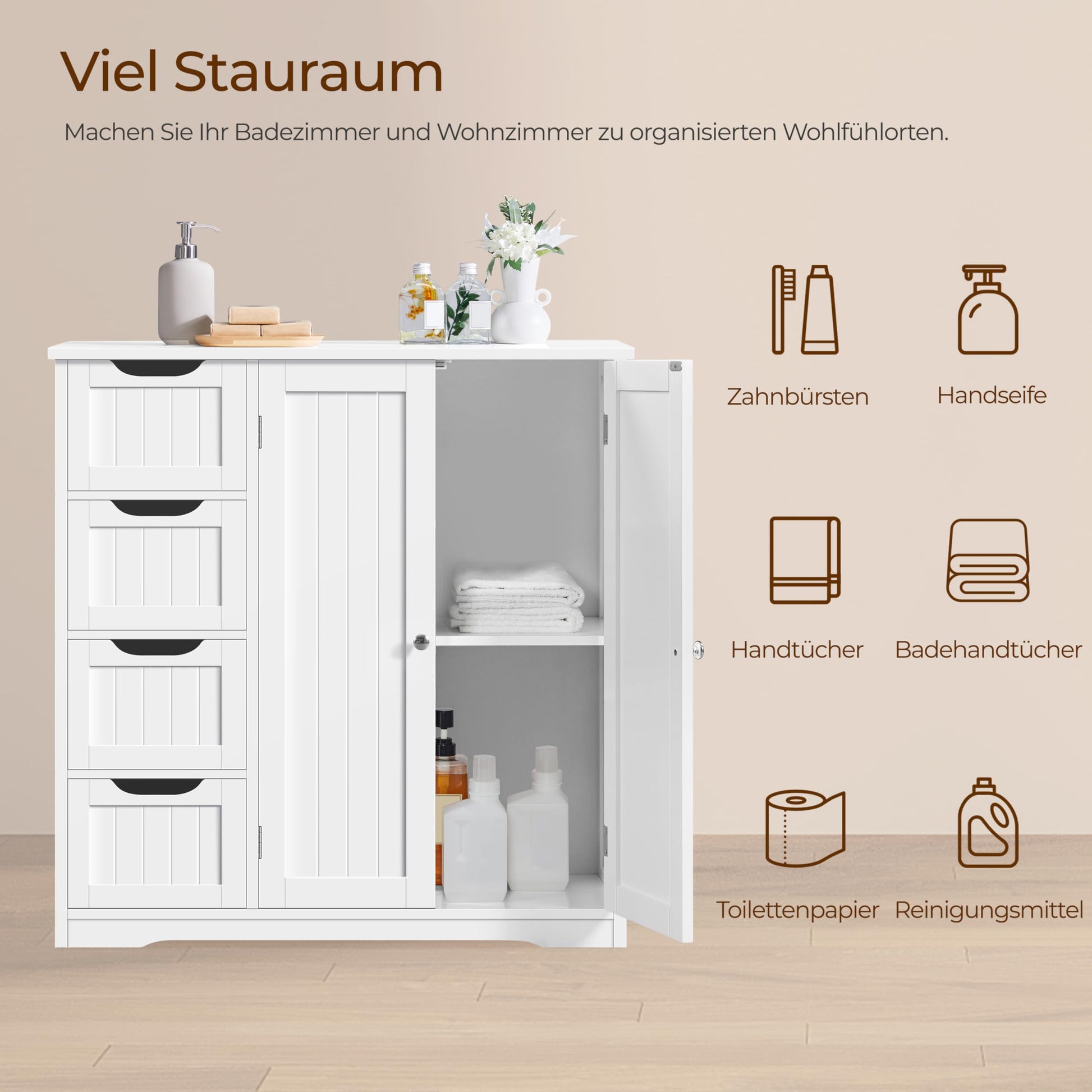 - LARGE STORAGE SPACE This floor cabinet features a wide table top, 4 drawers and a cabinet with 2 storage compartments. They ensure that the utensils are stored in different compartments and keep your bathroom tidy and tidy