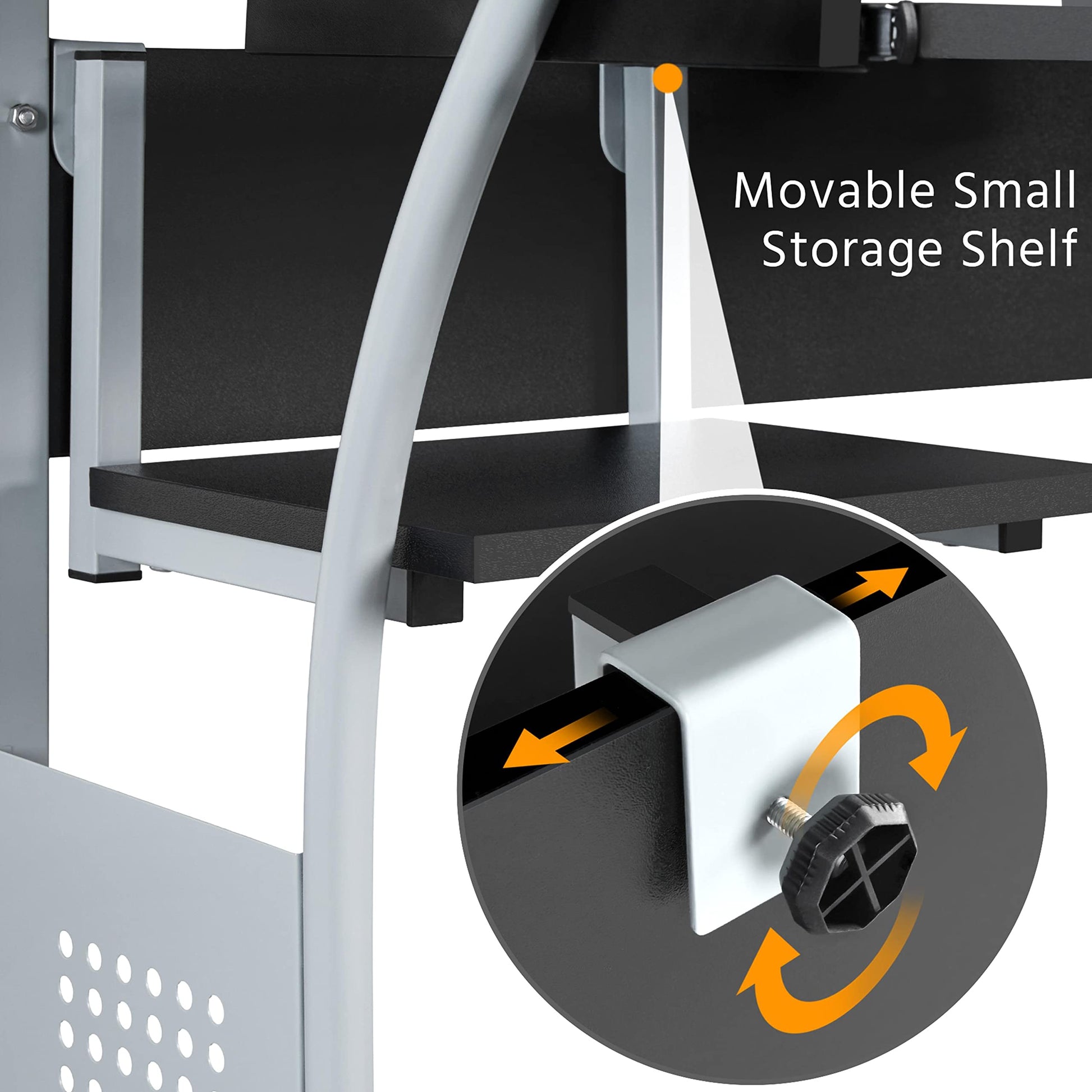 - LARGE STORAGE SPACE The 4 tier desk provides ample storage space as well as a generous countertop. Printer or fax machine on the top level, computer/notebook on tabletop and also keyboard plate, books on the third small level under the worktop and mainframe on the lower.