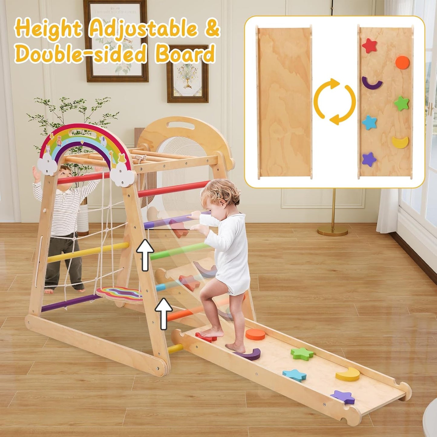 Unser Kinder-Klettergerüst im Regenbogen-Design bietet zahlreiche Spielmöglichkeiten. Ausgestattet mit einem Holzschaukel, Kletterbrett und einer Rutsche vereint es Spielspaß und Bewegung. Die bunte Holzstange auf einer Seite und das Kletterseil auf der anderen fördern die Koordination und Geschicklichkeit der Kinder