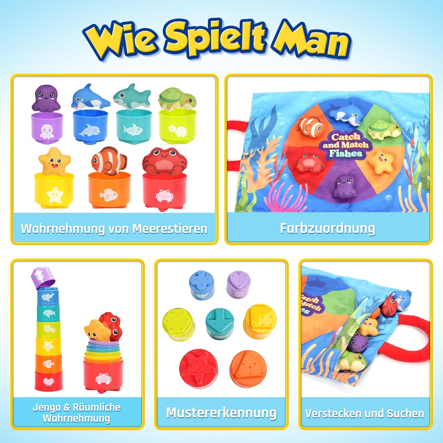 - GROWTH THROUGH PLAYFUL LEARNING Classic educational toys such as fishing game, color pairing, shape recognition, stacking games and identifying marine life provide different ways to play. These games promote children's hand-eye coordination, reaction speed, motor skills and colour recognition skills
